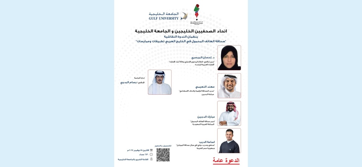 ينظم  اتحاد الصحفيين  الخليجيين بالتعاون مع  الجامعة الخليجية  ندوة نقاشية بعنوان “الهاتف المحمول في الخليج العربي: تطبيقات وممارسات”، بمشاركة عدد من المتحدثين من مملكة البحرين ودول مجلس التعاون لدول الخليج العربية.