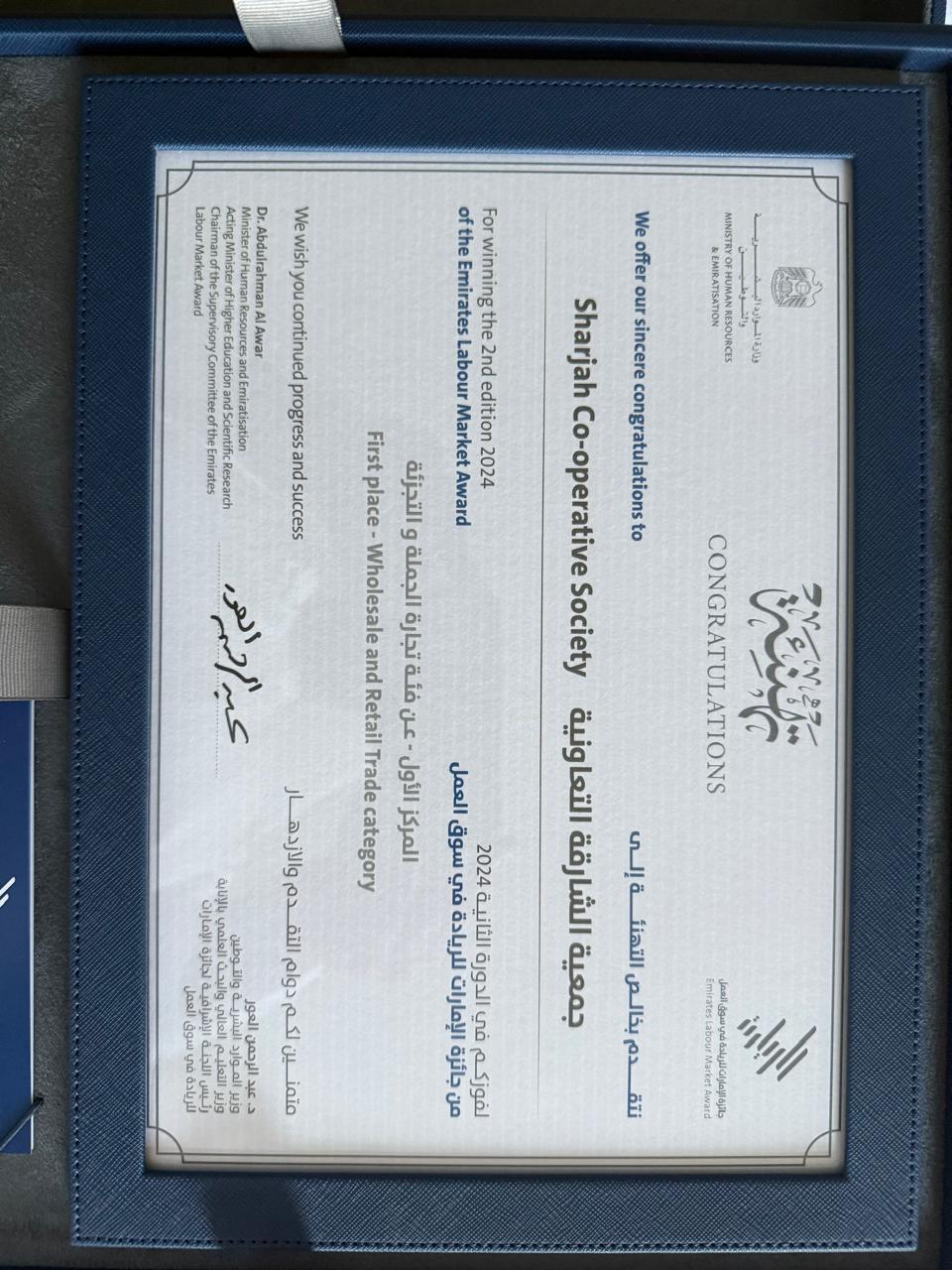 تحت رعاية سمو الشيخ منصور بن زايد آل نهيان، نائب رئيس الدولة، نائب رئيس مجلس الوزراء، رئيس ديوان الرئاسة، كرّم سمو الشيخ ذياب بن محمد بن زايد آل نهيان، نائب رئيس ديوان الرئاسة للشؤون التنموية وأسر الشهداء، رئيس مجلس الشؤون الإنسانية الدولية، ومعالي الدكتور عبد الرحمن العور، وزير الموارد البشرية والتوطين، تعاونية الشارقة بجائزة الإمارات للريادة في سوق العمل، في دورتها الثالثة حيث تسلم الجائزة عن سعادة الرئيس التنفيذي ماجد الجنيد، السيد هلال المحرم مدير إدارة الموارد البشرية في تعاونية الشارقة.