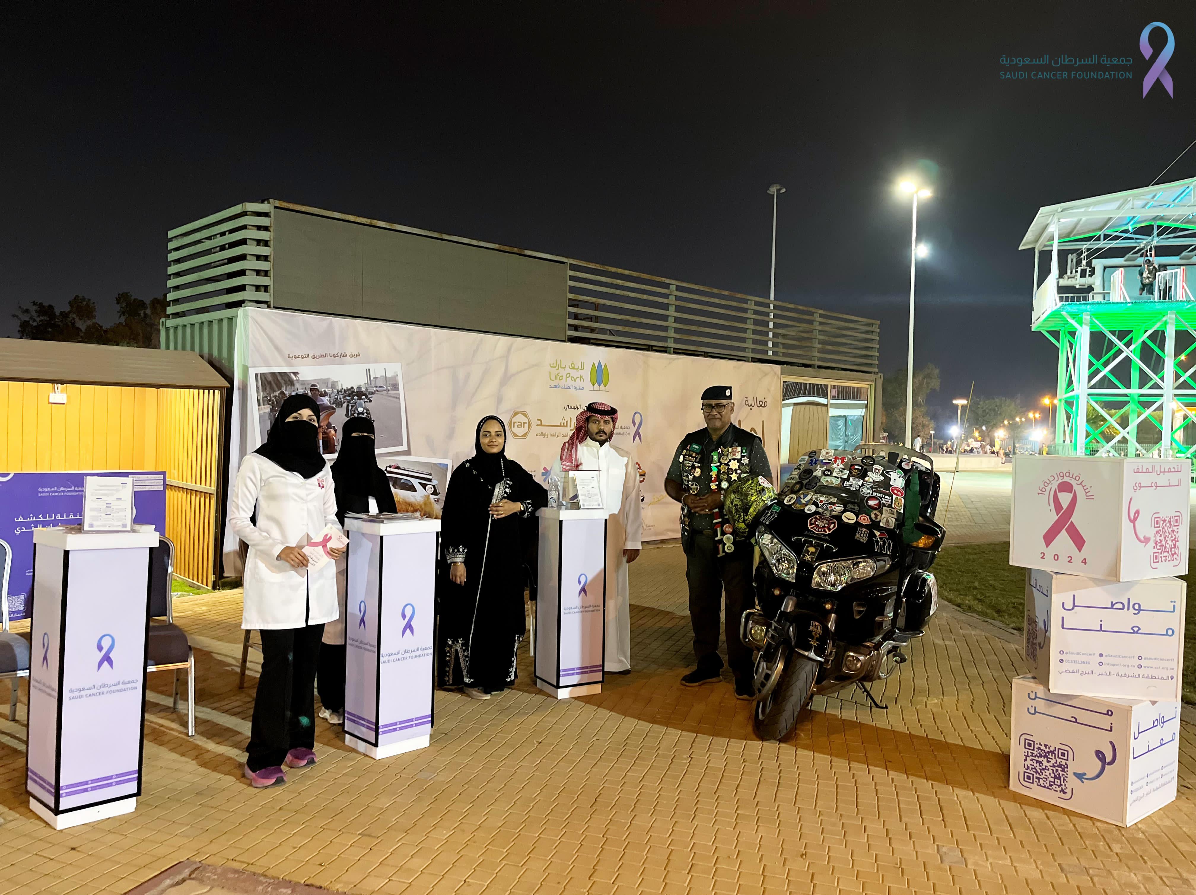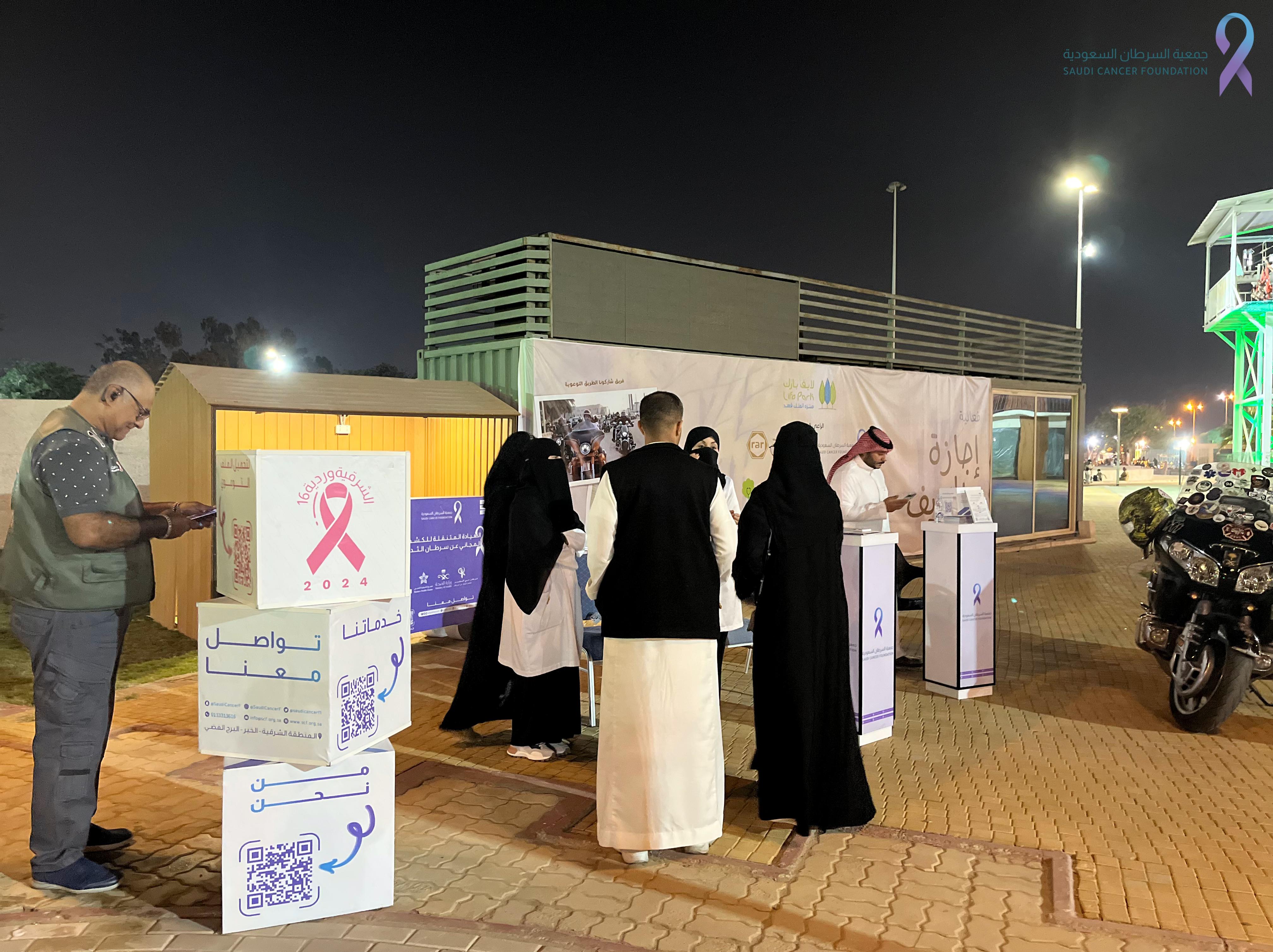 شاركت جمعية السرطان السعودية كراعي رئيسي لفعالية إجازة الخريف وسط أجواء اجتماعية عائلية متنوعة تهدف لتوعية أفراد المجتمع عن سرطان الثدي خاصة السيدات من خلال أركان تعريفية عن خدمات الجمعية وبرامجها حيث تضمنت استشارات ونصائح تثقيفية منها آلية الفحص الذاتي بمشاركة متطوعين صحيين وذلك على مدار 3 أيام في منتزة الملك فهد بالدمام يصاحبها فعاليات عديدة منها عروض وأنشطة سيارات ودرجات نارية إضافة لشخصيات كرتونية ورسم على الوجه للأطفال