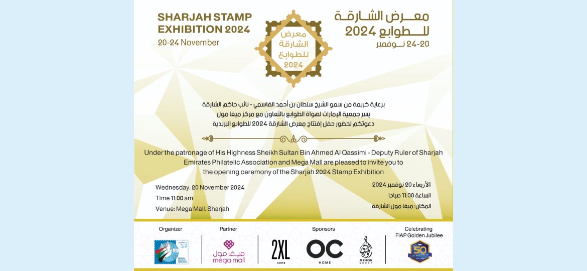 تنطلق فعاليات معرض الشارقة للطوابع ٢٠٢٤ يوم الأربعاء القادم ٢٠ نوفمبر لمدة خمسة أيام تحت رعاية كريمة من سمو الشيخ سلطان بن أحمد القاسمي نائب حاكم الشارقة، وهواة الطوابع يأخذهم الشوق والعشق للمشاركة والحضور للاستفاده من فعاليات معرض الشارقة للطوابع، حيث سيشارك اكثر من (٩٢) هاو من ١٤ دوله من مختلف دول العالم، وكذلك سيشارك تجار وشركات الطوابع واكسسواراتها في قسم خاص بهم ،وسيكون من ضمن فعاليات المعرض ورش عمل ومحاضرات خاصه بالطوابع، وقد حدد يوم الجمعه لعمل مزاد دولي للطوابع،