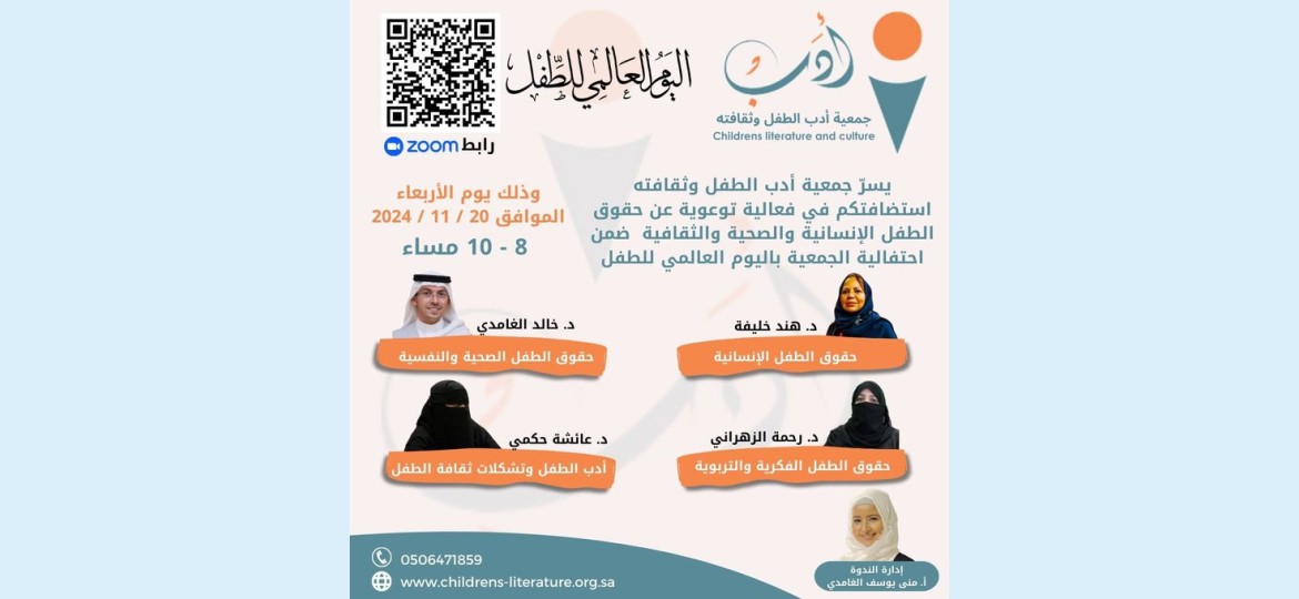 دعت جمعية أدب الطفل وثقافته للقاء بعنوان "الطفل وحقوقه الإنسانية"، وذلك ضمن احتفالية الجمعية باليوم العالمي للطفل.