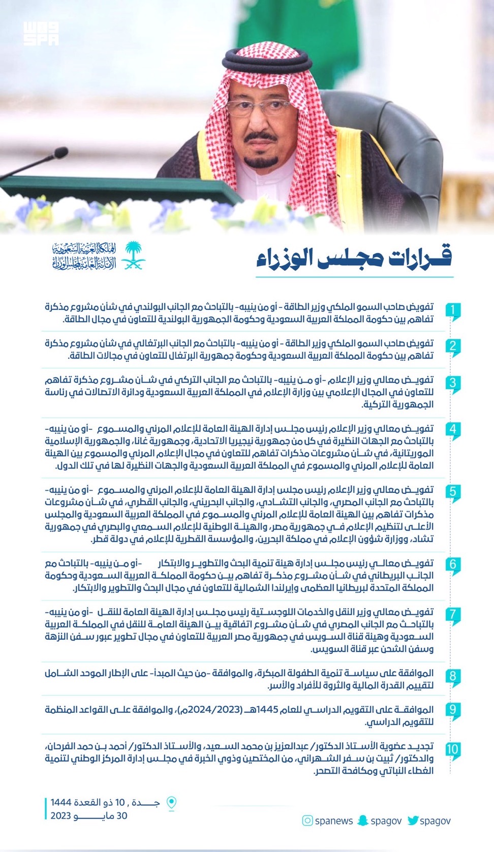 تفويض صاحب السمو الملكي وزير الطاقة - أو من ينيبه - بالتباحث مع الجانب البولندي في شأن مشروع مذكرة تفاهم بين حكومة المملكة العربية السعودية وحكومة الجمهورية البولندية للتعاون في مجال الطاقة.