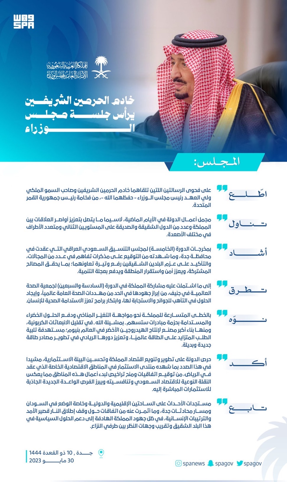 وفي مستهل الجلسة، اطّلع مجلس الوزراء على فحوى الرسالتين اللتين تلقاهما خادم الحرمين الشريفين وصاحب السمو الملكي ولي العهد رئيس مجلس الوزراء - حفظهما الله -، من فخامة رئيس جمهورية القمر المتحدة.