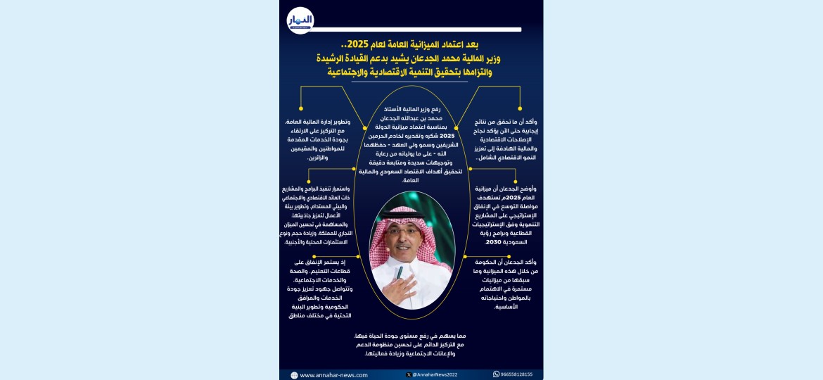 وأكد الجدعان أن الحكومة من خلال هذه الميزانية وما سبقها من ميزانيات مستمرة في الاهتمام بالمواطن واحتياجاته الأساسية، إذ يستمر الإنفاق على قطاعات التعليم، والصحة والخدمات الاجتماعية، وتتواصل جهود تعزيز جودة الخدمات والمرافق الحكومية وتطوير البنية التحتية في مختلف مناطق المملكة، مما يسهم في رفع مستوى جودة الحياة فيها، مع التركيز الدائم على تحسين منظومة الدعم والإعانات الاجتماعية وزيادة فعاليتها.