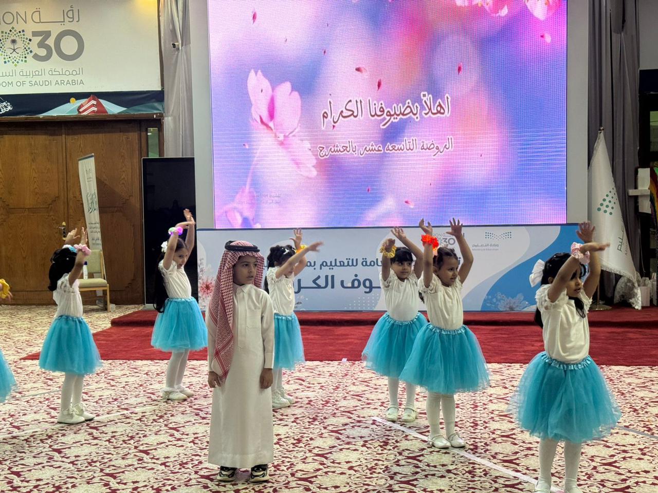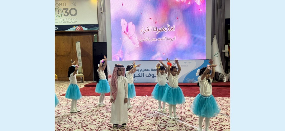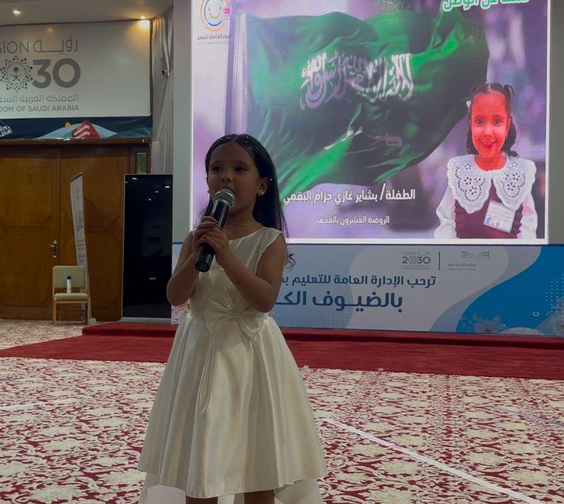 وقد استهل الحفل بآيات من القران الكريم تلا ذلك كلمة للمساعد للشؤون التعليمية للبنات أكدت فيها سعي حكومتنا الرشيدة في إتاحة وتوفير بيئة آمنة ومحفزة تضمن للطفل حق الرعاية والحماية والترفيه، ‏وتمكينه من التمتع بطفولة سعيدة، مبينة أن رؤية المملكة 2030 أولت اهتمامًا بالغًا بمرحلة الطفولة من خلال تعزيز أوجه الرعاية التي تمكن الطفل من تنمية ‏مهاراته وقدراته وترسيخ القيم الإيجابية لديه، ‏بالإضافة إلى حق الطفل في التعليم ‏كحق مركزي وشرط أساسي في تمكين الطفل،