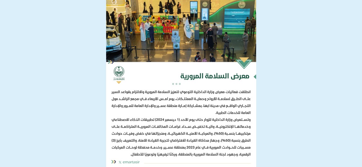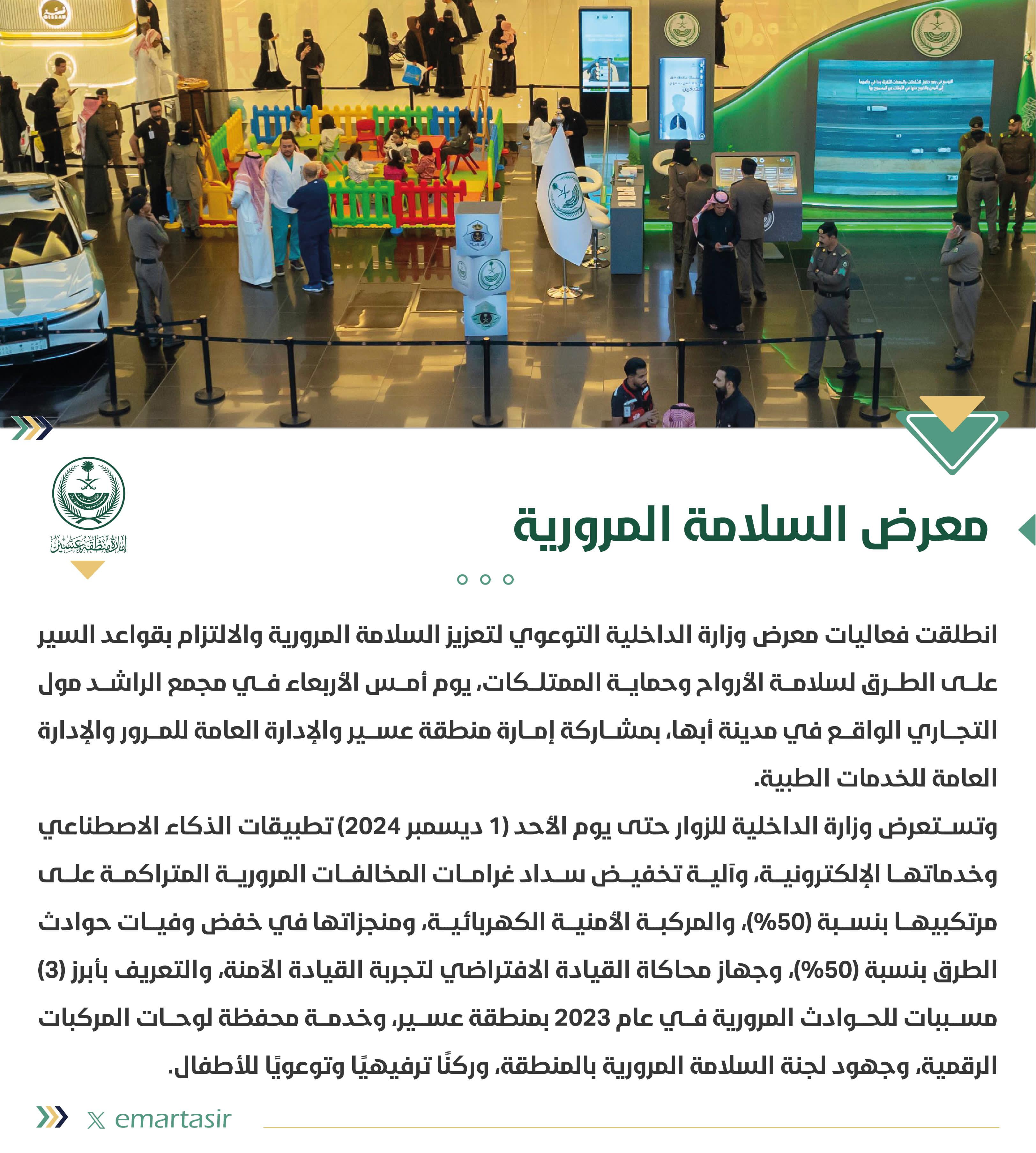 وتستعرض وزارة الداخلية للزوار حتى يوم الأحد (1 ديسمبر 2024) تطبيقات الذكاء الاصطناعي وخدماتها الإلكترونية، وآلية تخفيض سداد غرامات المخالفات المرورية المتراكمة على مرتكبيها بنسبة (50%)، والمركبة الأمنية الكهربائية، ومنجزاتها في خفض وفيات حوادث الطرق بنسبة (50%)، وجهاز محاكاة القيادة الافتراضي لتجربة القيادة الآمنة، والتعريف بأبرز (3) مسببات للحوادث المرورية في عام 2023 بمنطقة عسير، وخدمة محفظة لوحات المركبات الرقمية، وجهود لجنة السلامة المرورية بالمنطقة، وركنًا ترفيهيًا وتوعويًا للأطفال.