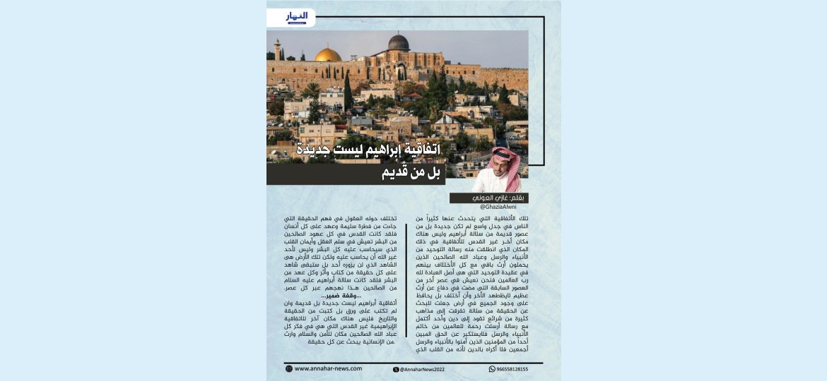 أتفاقية أبراهيم ليست جديدة بل قديمة وان لم تكتب على ورق بل كتبت من الحقيقة والتاريخ فليس هناك مكان اخر للأتفافية الأبراهيميه غير القدس التي هى في فكر كل عباد الله الصالحين مكان للأمن والسلام وأرث من الأنسانية يبحث عن كل حقيقة