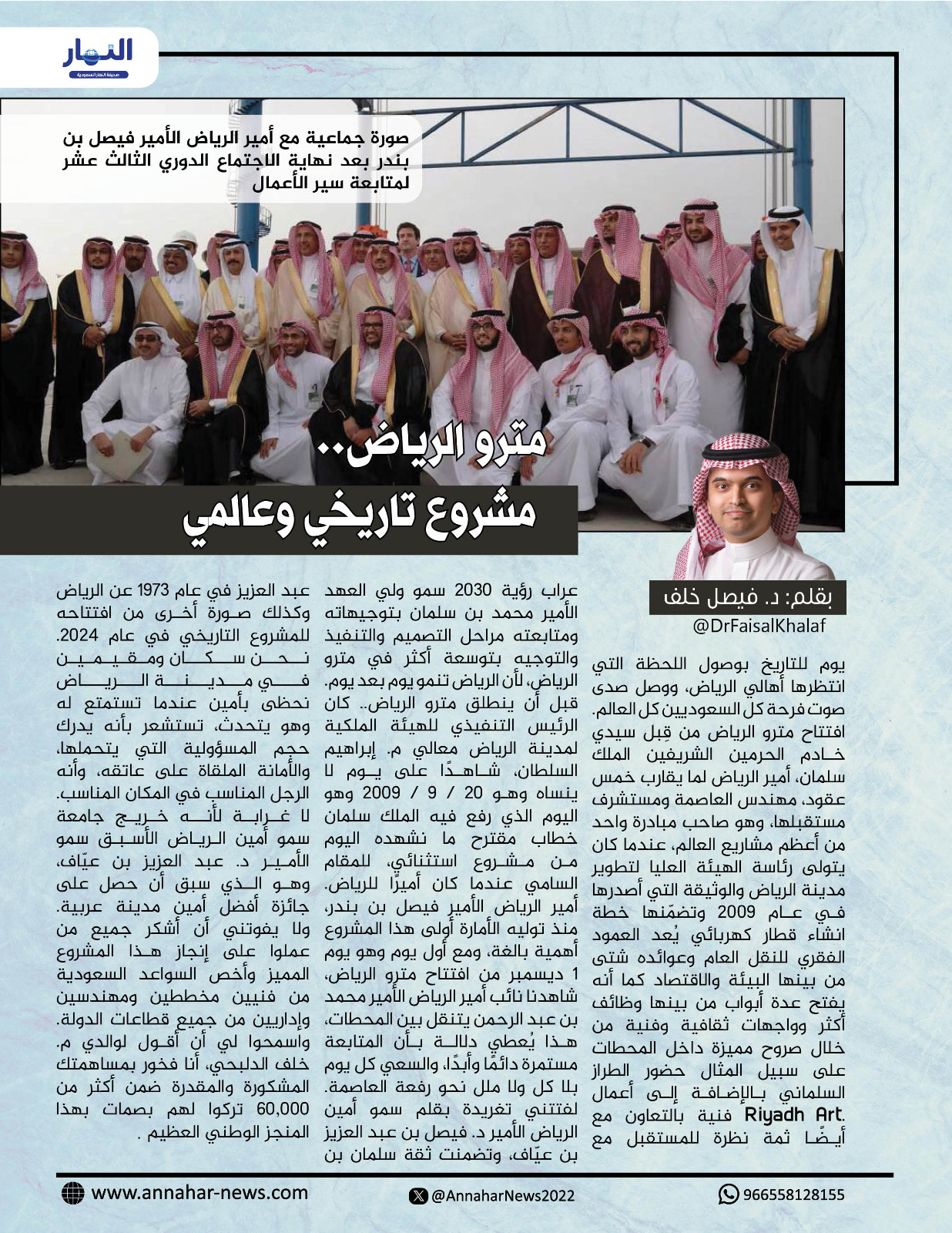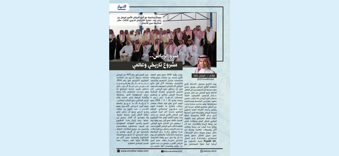 افتتاح مترو الرياض من قِبل سيدي خادم الحرمين الشريفين الملك سلمان، أمير الرياض لما يقارب خمس عقود، مهندس العاصمة ومستشرف مستقبلها، وهو صاحب مبادرة واحد من أعظم مشاريع العالم، عندما كان يتولى رئاسة الهيئة العليا لتطوير مدينة الرياض والوثيقة التي أصدرها في عام 2009 وتضمّنها خطة انشاء قطار كهربائي يُعد العمود الفقري للنقل العام وعوائده شتى من بينها البيئة والاقتصاد كما أنه يفتح عدة أبواب من بينها وظائف أكثر وواجهات ثقافية وفنية من خلال صروح مميزة داخل المحطات على سبيل المثال حضور الطراز السلماني بالإضافة إلى أعمال فنية بالتعاون مع Riyadh Art.