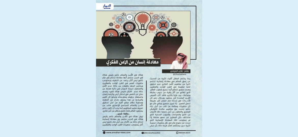 ربما يختصر المقال أشياء كثيرة من الحديث عن عمق السلام في معادلة إنسانية تختصر كثيراً من مفاهيم الأمن الفكري نحو تحقيق غاية عظيمة في القرن الواحد والعشرين وهدف سامي تتطلع أليه جميع شعوب العالم التي تعاني من آثار باقية من حروب سابقة وصراعات بين فترة وأخرى فلقد كان تأسيس الأمم المتحدة أمل منشود ومازال رغم كل الأحداث في إعادة فكر انسان إلى طبيعة تحمل الضمير بلا تمييز عنصري ورقي فكر مع كل متغيرات وسلامة من قلب من أجل بناء حاضر يتجدد مع مفاهيم صالحة للتعايش السلمي والتعاون من أجل حماية ذلك الأنسان من الضرر والصراعات والحروب المدمرة التي ستختلف بكل المعايير عن عصور سابقة إذا لم نستوعب تلك المعادلة الإنسانية التي تبحث عن نضوج فكر في ظل متغيرات عصرية كثيرة حين يستشعر الفكر قيمة ذلك بأن ليس هناك في الأمن والسلام خاسر وليس هناك في الحرب منتصر أنها معادلة تحتاج إلى فكر ناضج ليس أكثر يبتعد عن التطرف و يستوعب متغيرات العصر في القرن الواحد والعشرين ويختصر الجهد والوقت من حالة عدم الأمن والاستقرار نتيجة الدوران في دائرة فارغة من حالة عدم الأتزان فليس هناك شيء يسمى دفاع عن النفس في احتلال أرض وكرامة إنسان واضطهاد حقوقه ومقدساته وتجاوز كل القيم والمبادئ بل هذا يسمى دفاع عن التطرف ومحاربة نظام دولي أقيم من اجل تحقيق الأمن والسلام للمجتمع الإنساني فلابد من تعريف سليم للمفاهيم كما يجب أن تكون حتى يستعيد العالم فكراً ناضج ونظام من أمن فكري.