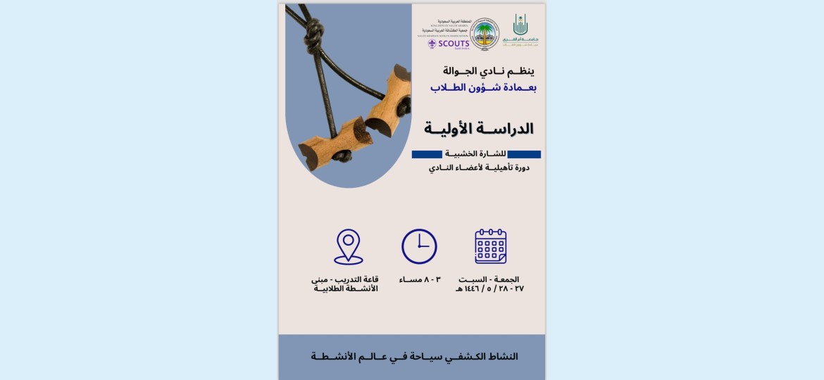 باهتمام بالغ من الدكتورة ياسمين رشيدي عميدة شؤون الطلاب ،ومتابعة من الدكتور أحمد محروس وكيل الأنشطة والتدريب الطلابي ( قسم الأنشطة والفعاليات) ، ومتابعة مستشار نادي الجوالة د.عبد الرحمن مدخلي و الأستاذ أحمد حبيب الله مشرف نادي الجوالة ، انطلقت يوم الجمعة 29 نوفمبر 2024، الدراسة الأولية للشارة الخشبية الكشفية، التي أقامتها جوالة جامعة أم القرى ممثلة بعمادة شؤون الطلاب، بإشراف من جمعية الكشافة العربية السعودية ،وبلغ عدد المشاركات في الدراسة (١٦ ) جوالة مشاركة من فتيات الجوالة ، وعدد 4 من قائدات التدريب المؤهلات
