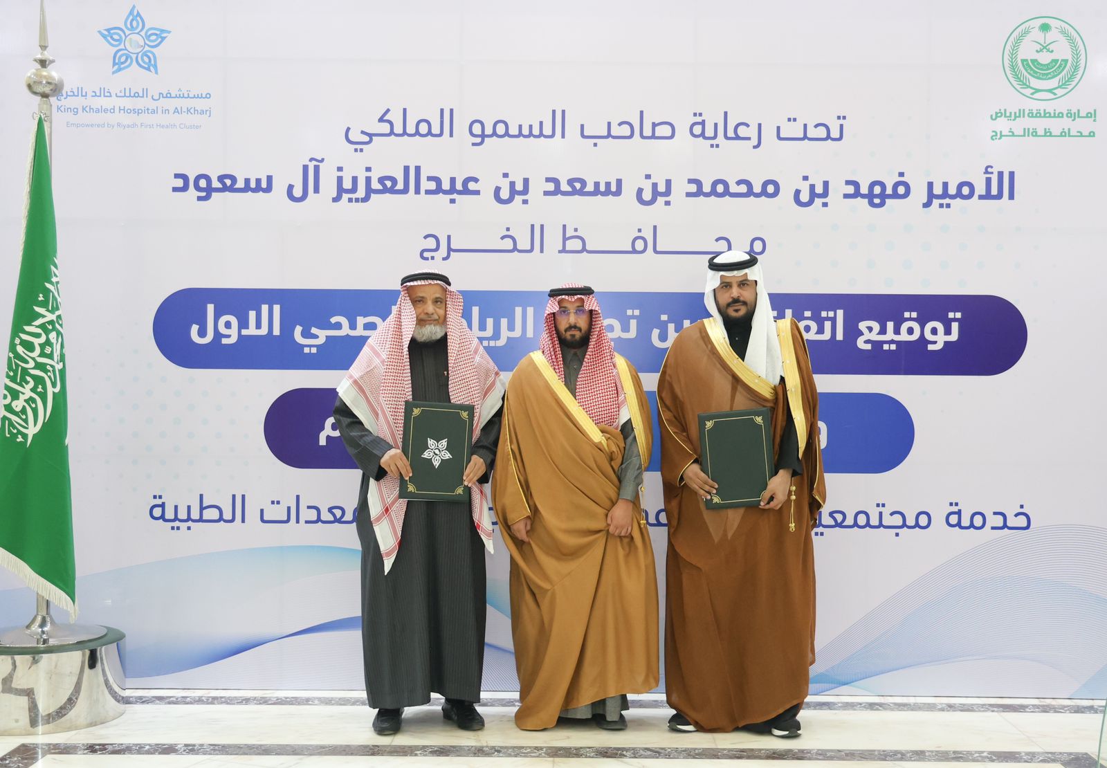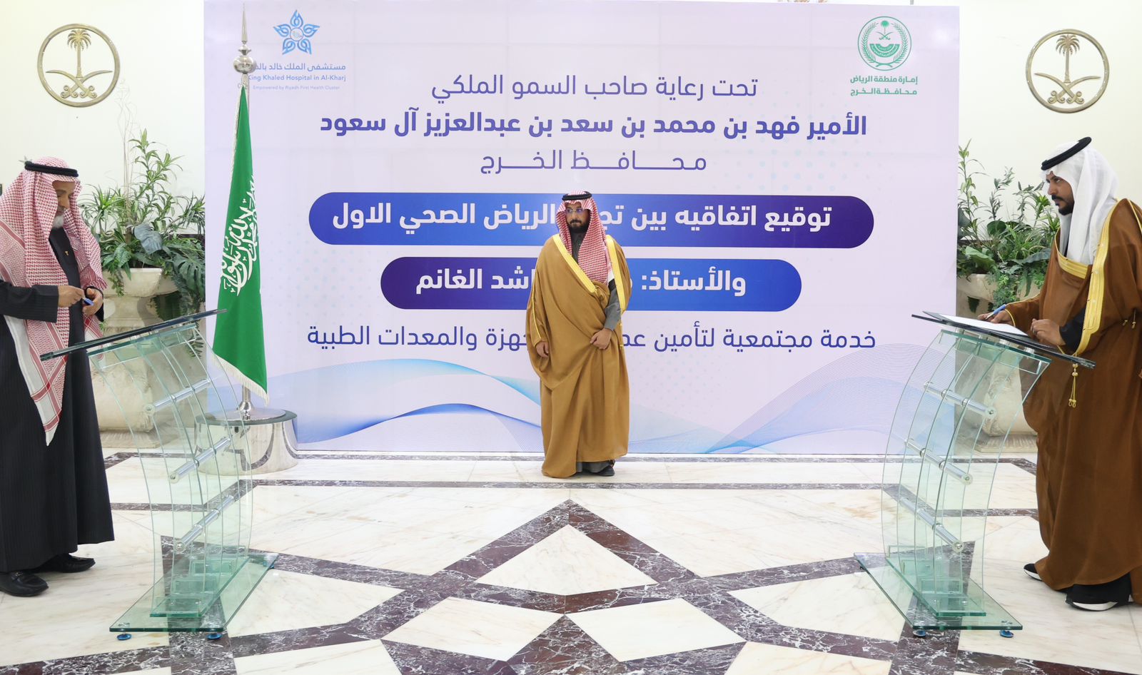 بعد ذلك، رعى سمو المحافظ توقيع اتفاقية شراكة مجتمعية بين نطاق الخرج الصحي ورجل الأعمال خالد بن راشد الغانم، لدعم مستشفى الملك خالد بالخرج بتجهيزات طبية.