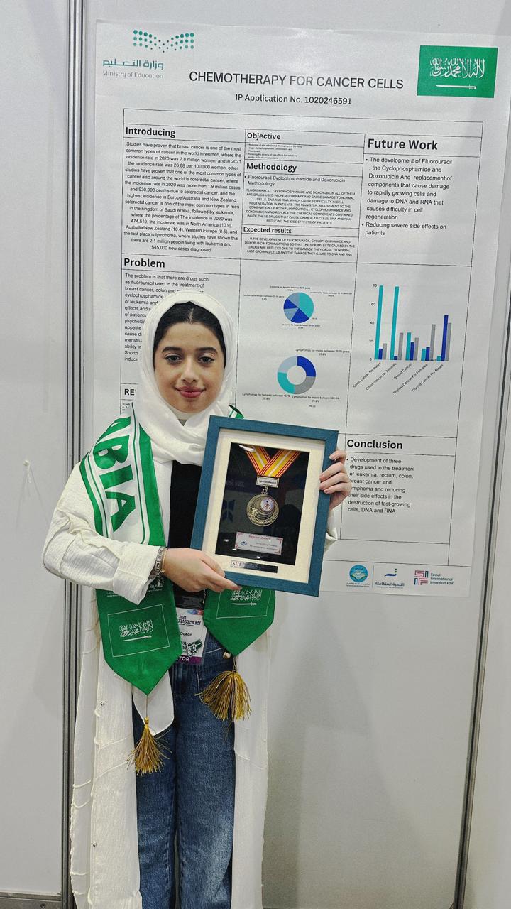 في إنجاز سعودي علمي عالمي جديد، فازت الطالبة تهاويل الدويش بجائزة خاصة من الجمعية التايوانية للاختراعات، عن مشروعها البحثي " العلاج الكيميائي للخلايا السرطانية".