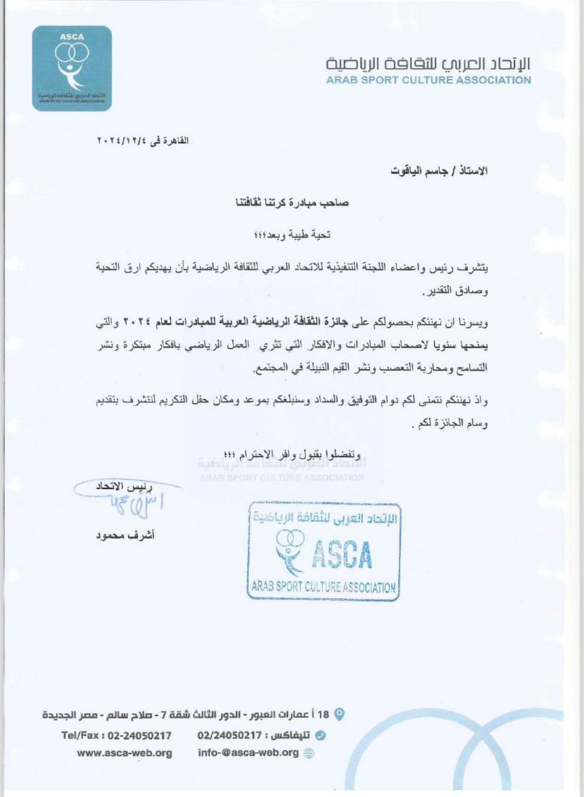 أعلن الاستاذ اشرف محمود رئيس الاتحاد العربي للثقافة الرياضية منح الدكتور جاسم الياقوت نائب إتحادي الاعلاميين العرب والمبدعين العرب وصاحب مبادرة كرتنا ثقافتنا جائزة الثقافة الرياضية العربية للمبادرات لعام 2024 تقديرا لمبادرته القيمة كرتنا ثقافتنا التي فازت بجائزة كتب السلام الدولية.