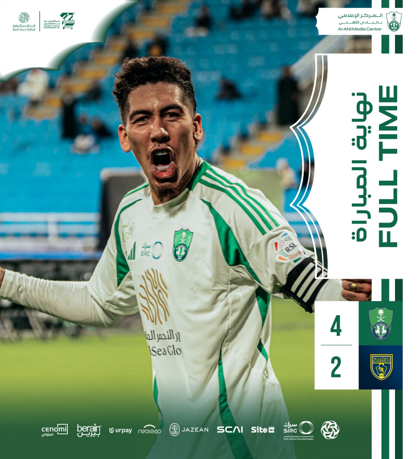 سجل للأهلي ايبانيز (45+8) وفراس البريكان (52) وفيرمينيو (63) ورياض محرز (73).