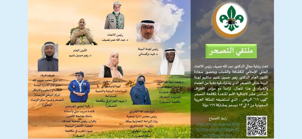 تحت رعاية معالي الدكتور عبدالله نصيف رئيس الاتحاد العالمي الإسلامي للكشافة والشباب وبحضور سعادة الأمين العام للاتحاد سعازة الدكتور زهير بن حسين غنيم تنظم لجنة البيئة بالاتحاد ملتقى التصحر .