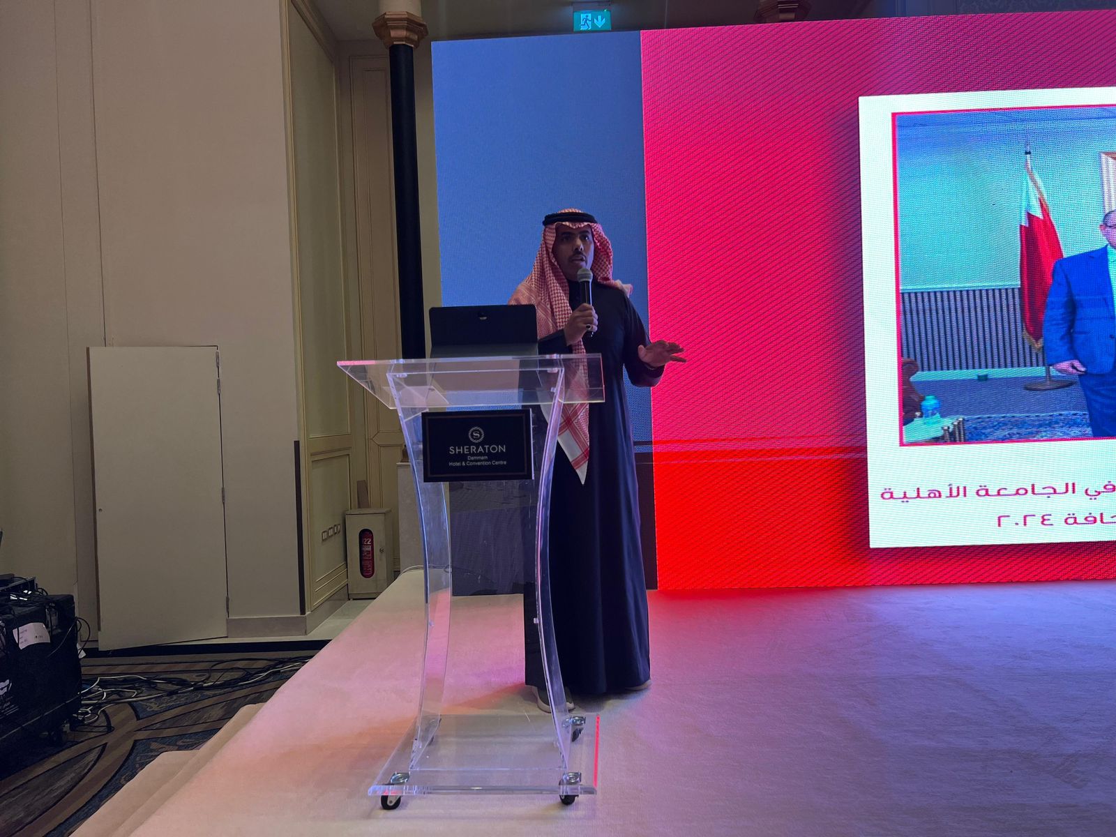 ومن ثم قدم الأستاذ خالد العبدالكريم كلمة قدم فيها الشكر والتقدير للجامعة الاهلية بمملكة البحرين مشيداً بالإنجازات التي تحققها الجامعة في جميع المجالات ومثمناً كل الجهود التي يبذلها الأساتذة والأكاديميون في إيصال رسالتهم التعليمية ومتمنياً التوفيق للجميع.