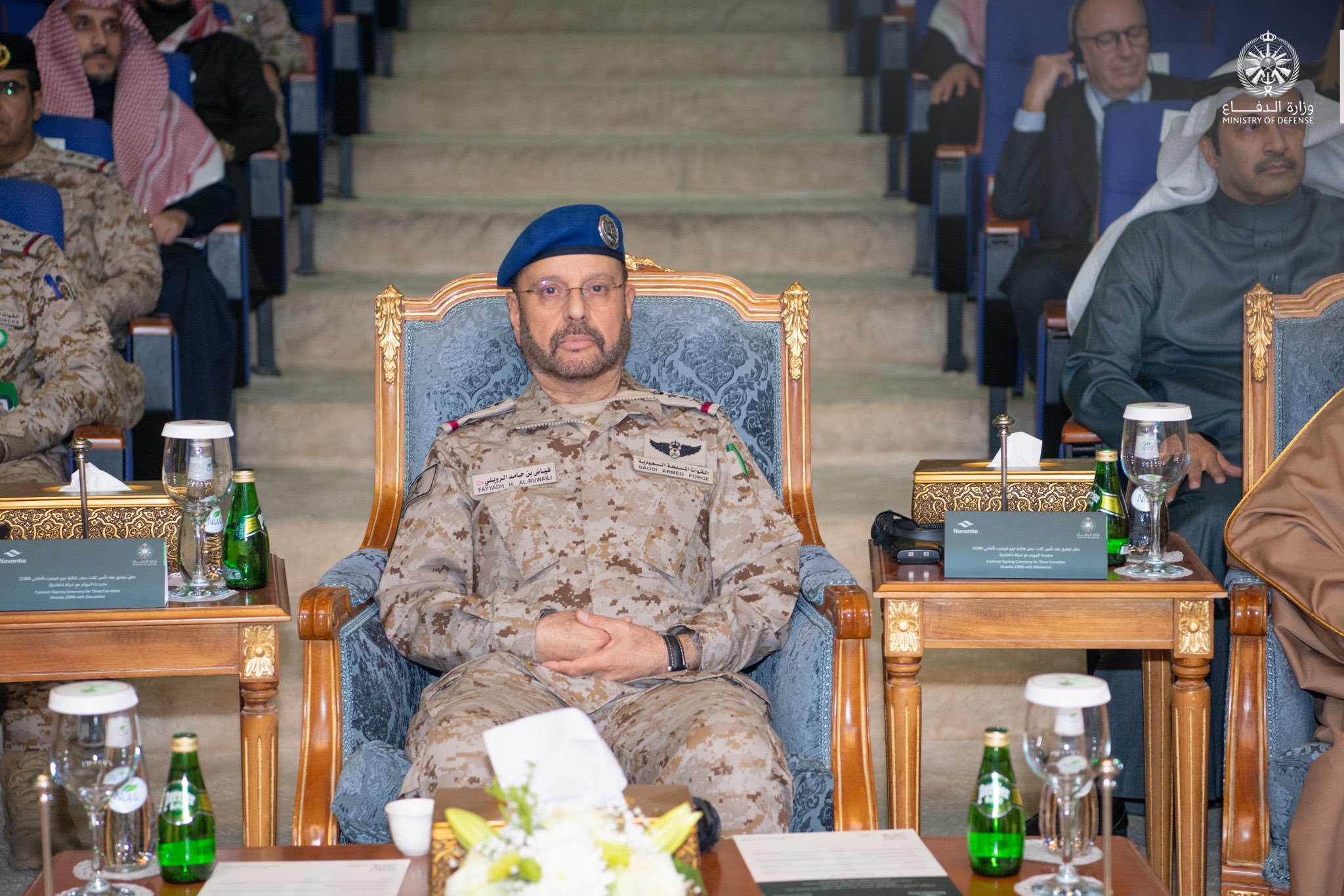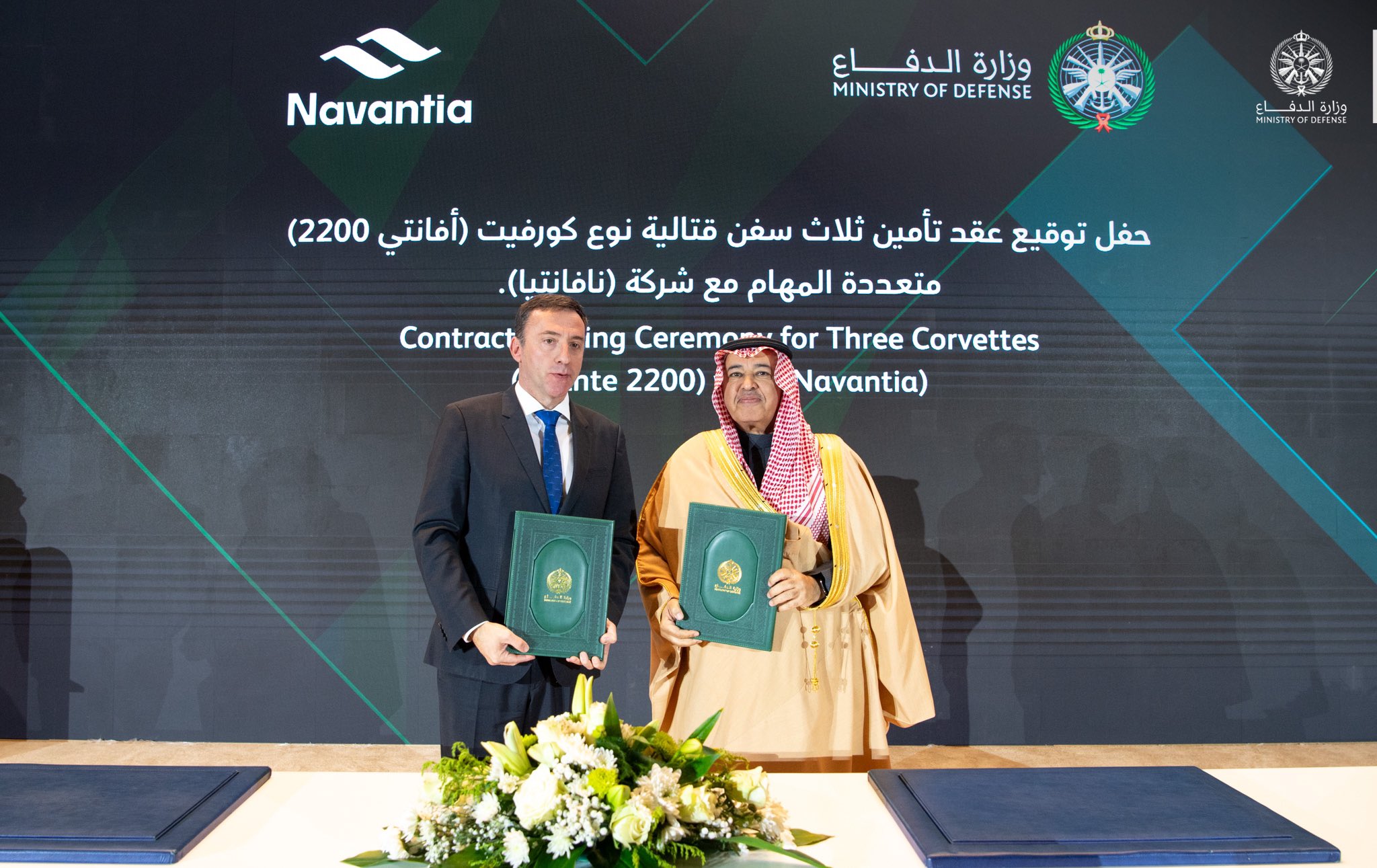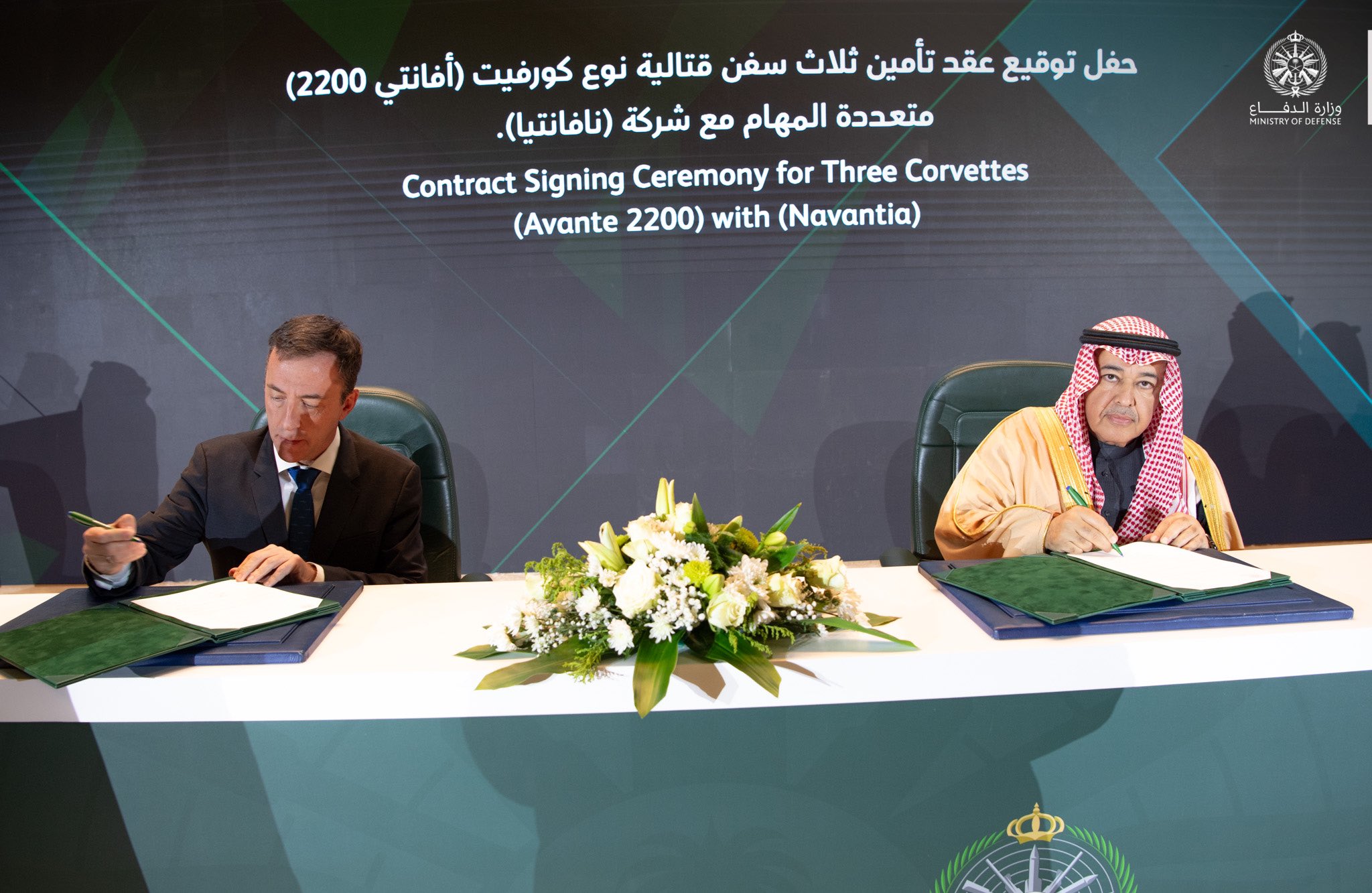 ووقع العقد من جانب الوزارة ، معالي مساعد وزير الدفاع للشؤون التنفيذية الدكتور خالد البِياري، ومن جانب شركة نافانتيا الإسبانية، رئيس مجلس الإدارة والمدير التنفيذي للشركة ريكاردو جارسيا باقيورو.
