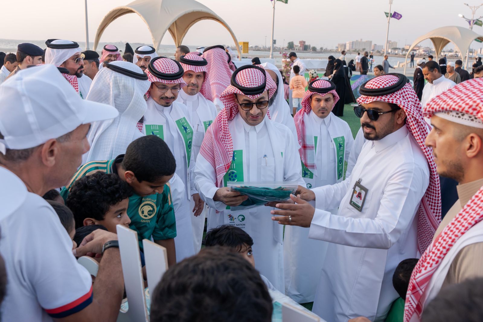 وقام أبناء الجمعية بتوزيع تيشيرتات المنتخب السعودي على الحضور، تعبيرًا عن فرحتهم بهذا الإنجاز الوطني الكبير، و مشاركة أبناء الوطن بهجتهم بهذا الحدث التاريخي.