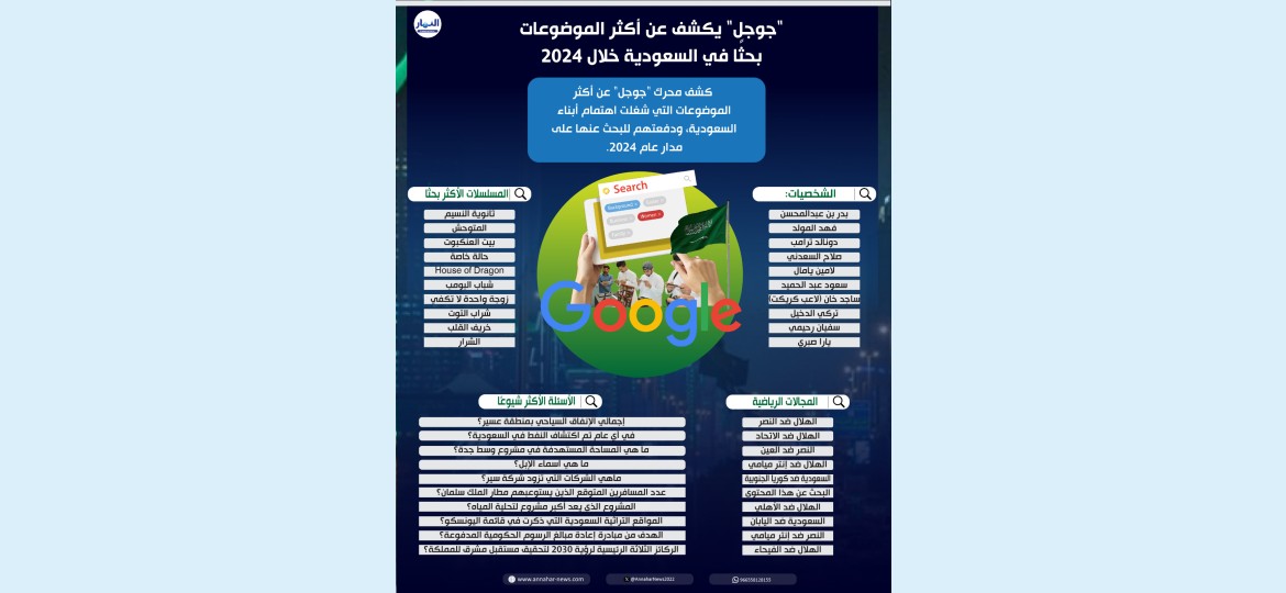 كشف محرك البحث العالمي "جوجل" عن أكثر الموضوعات التي شغلت اهتمام أبناء السعودية، ودفعتهم للبحث عنها على مدار عام 2024 المنصرم، وتوزعت هذه الاهتمامات بين شخصيات وموضوعات رياضية وأعمال درامية، وأسئلة عامة.