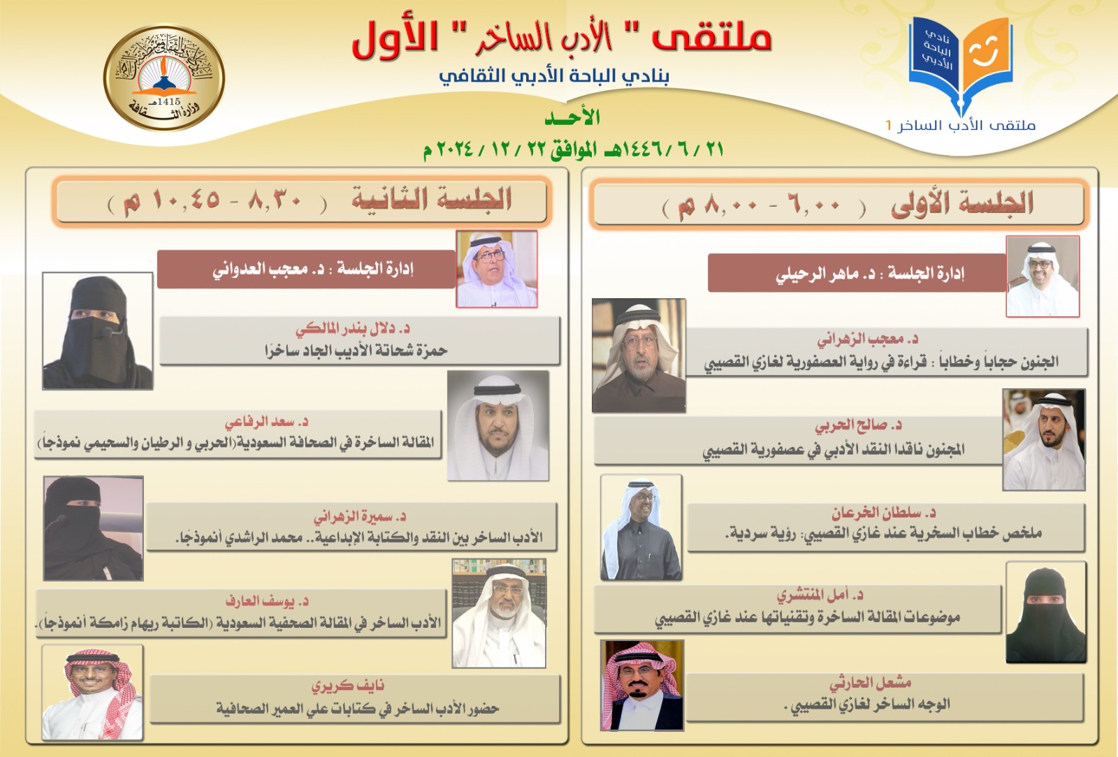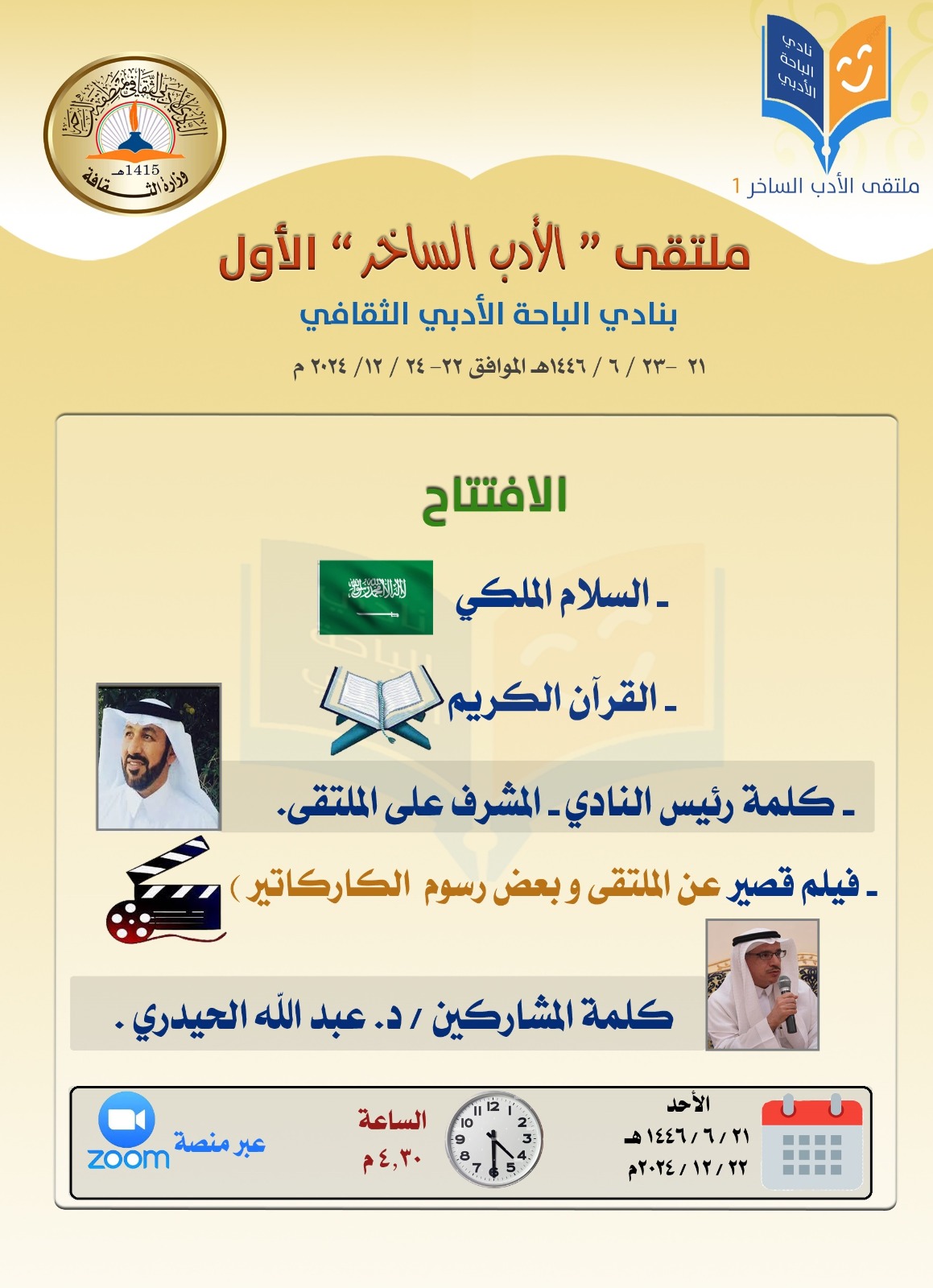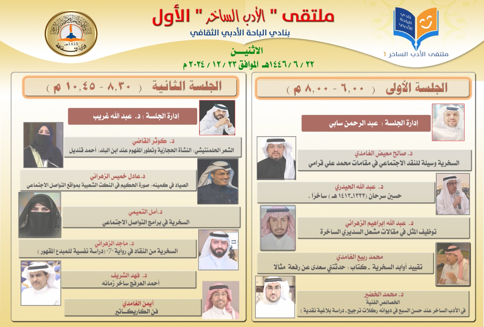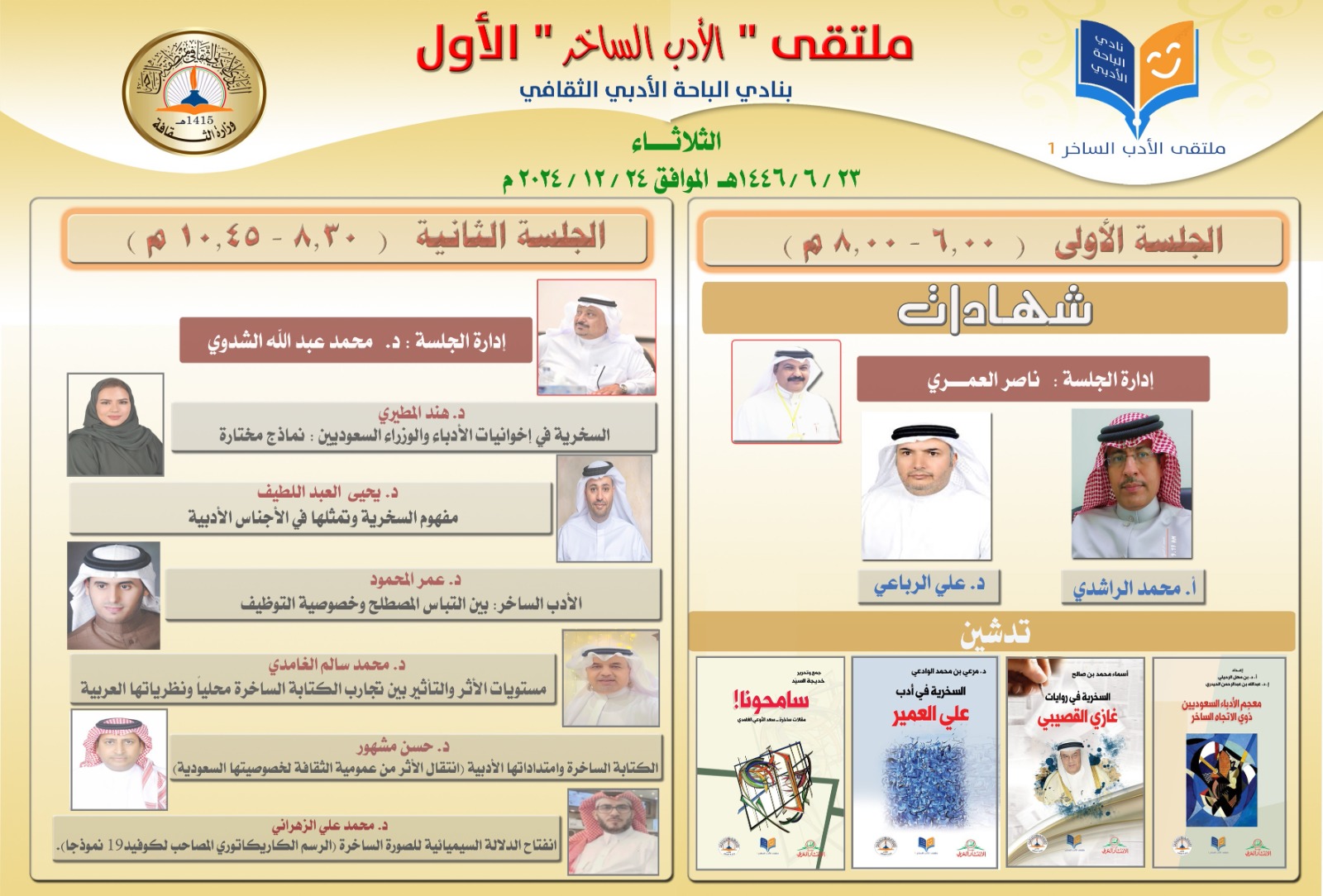 اعتمد رئيس مجلس إدارة نادي الباحة الأدبي الثقافي برنامج ملتقى الأدب الساخر الأول الذي سيقيمه النادي في الفترة من ٢١-٢٣ /٦ / ١٤٤٦هـ الموافق ٢٢ - ٢٤ ديسمبر ٢٠٢٤م وجدول جلسات الملتقى وعناوين الأوراق التي سيشارك بها نخبة من الأدباء والنقاد السعوديين في هذا الملتقى.