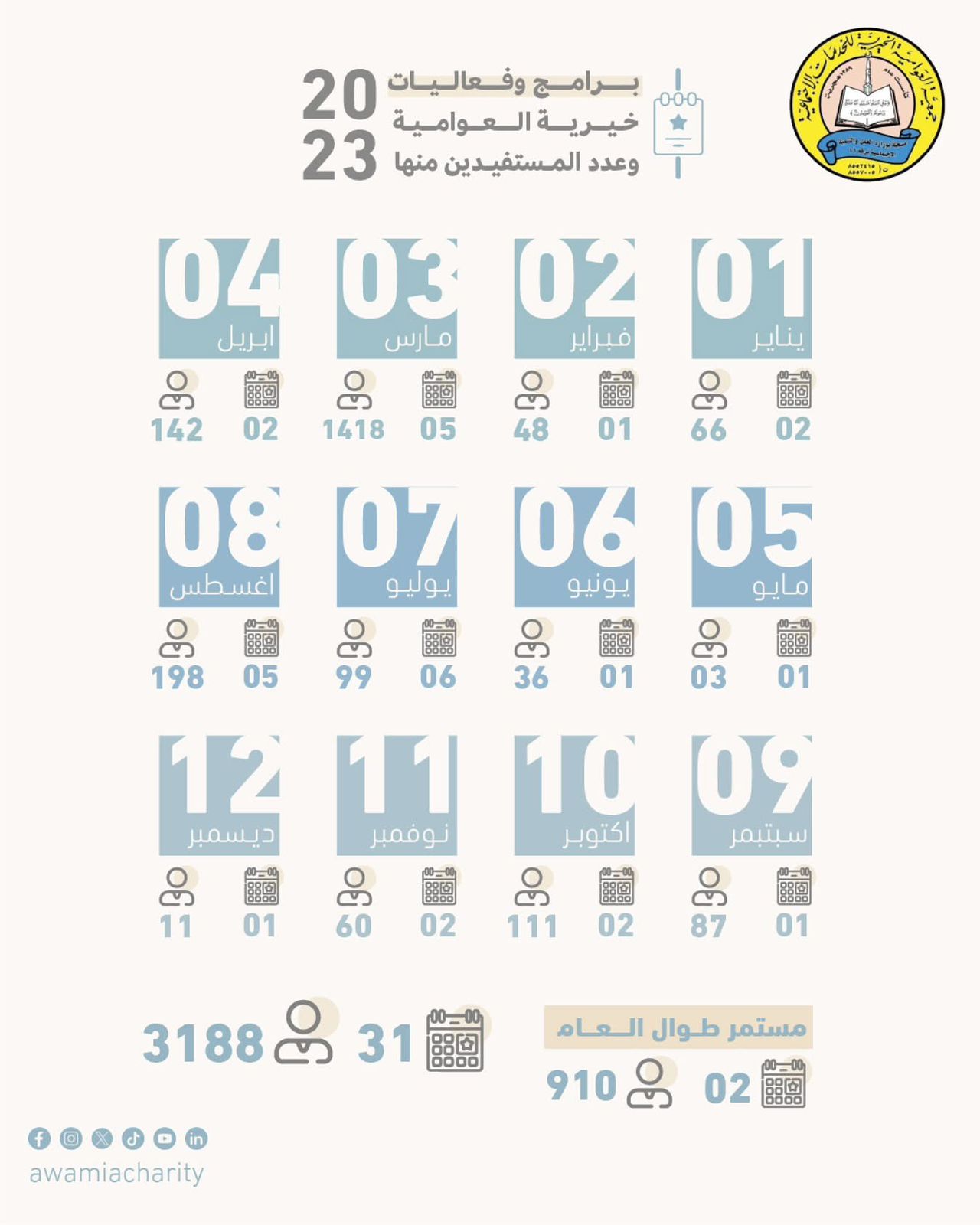 استفاد أكثر من 3188 مستفيدًا خلال العام 2023م من 31 فعالية وبرنامجًا بجمعية العوامية الخيرية للخدمات الاجتماعية.