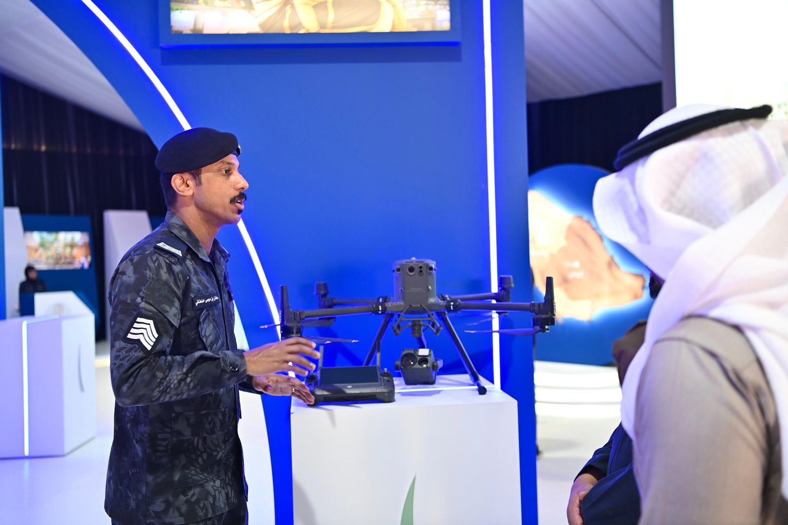 كما تستعرض القوات أحدث الأجهزة التقنية المتطورة وممكنات الذكاء الاصطناعي مثل الطائرة بدون طيار (الدرون) للاستطلاع والمراقبة الدقيقة وسرعة الاستجابة الأمنية، وحقيبة العمل المتنقلة التي تتيح للمنسوبين الدخول لأنظمة القوات الداخلية دعمًا لرجال الأمن خلال مهامهم الميدانية، والدوريات الذكية.