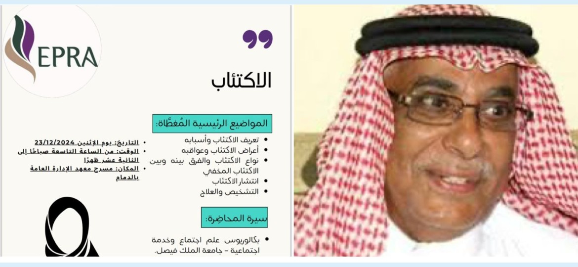 تقدم عضوة جمعية المتقاعدين بالمنطقة الشرقية الأستاذة مزيانة عبد المحسن الخليوي اليوم الإثنين 22-6-1446 هـ الموافق 23-ديسمبر-2024م محاضرة بعنوان (الإكتئاب ) من الساعة التاسعة صباحاً إلى الثانية عشر ظهرًا على مسرح معهد الإدارة العامة بالمنطقة الشرقية.