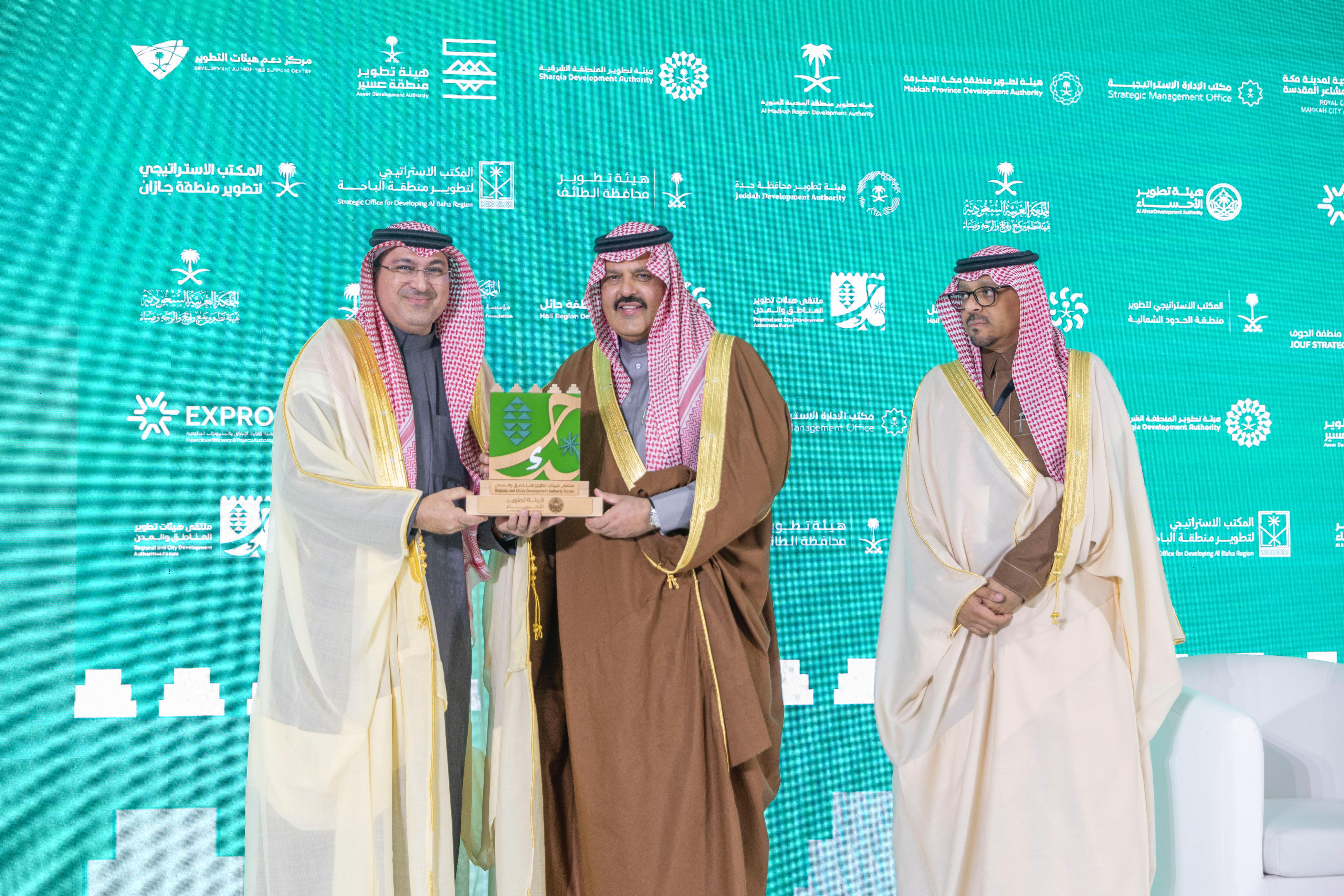 كما قام سموه بتكريم هيئة تطوير الاحساء على مشاركتها وتسلم التكريم المهندس زياد العرفج نائب الرئيس التنفيذي لقطاع الاستثمار وتطوير الشراكات، وتكريم جميع الهيئات الاخرى لدورهم في تعزيز وتطوير مدن ومناطق المملكة وتحقيقاً لمستهدفات رؤية المملكة 2030.