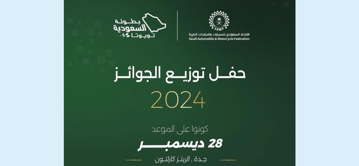 يحتفل الاتحاد السعودي للسيارات والدراجات النارية بتكريم أبطال بطولة السعودية تويوتا 2024، وذلك خلال حفل توزيع الجوائز السنوي، الذي يُقام يوم السبت الموافق 28 ديسمبر 2024، في فندق الريتز كارلتون بمدينة جدة.