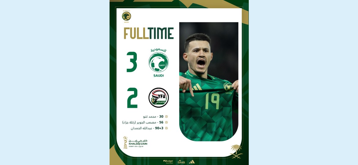 في واحدة من أفضل مباريات كأس الخليج الـ 26 تغلب المنتخب السعودي على نظيرة المنتخب اليمني بثلاثة أهداف مقابل هدفين، في المباراة التي جرت مساء اليوم الأربعاء ضمن مباريات المجموعة الثانية والتي لعبت على أرض استاد جابر المبارك.
