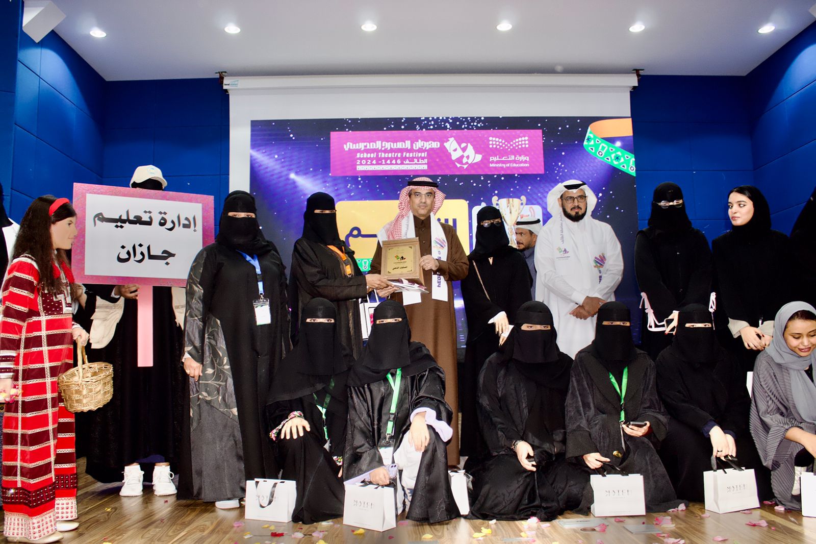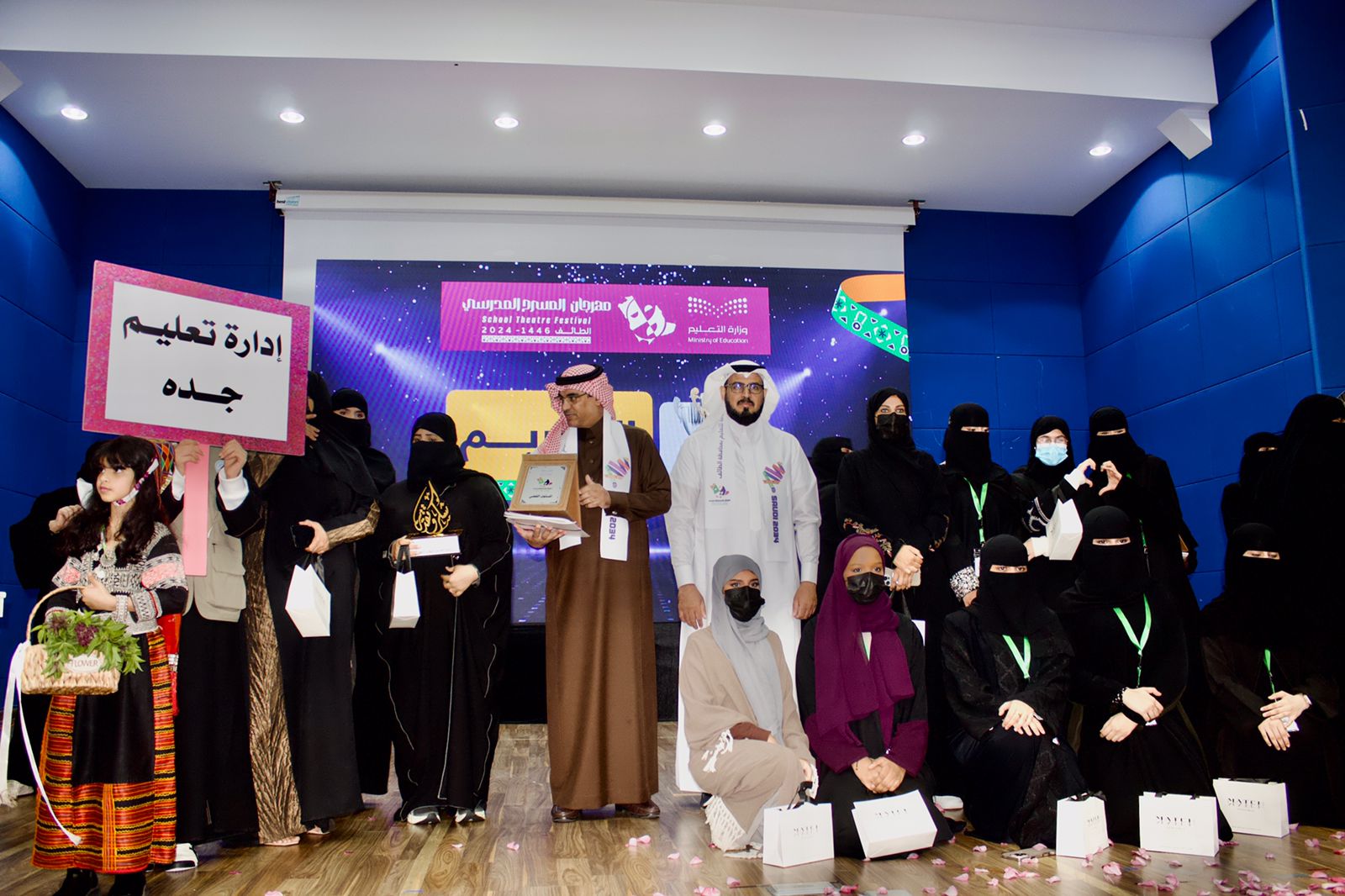 وثمن الغامدي على جهود الفريق المسرحي بمدارس الجيل لحصولها  على المركز الأول أملاً مضاعفة  الجهود لتعزيز هوايات ومهارات الطالبات  المسرحية "أفضل نص، وإخراج، وأداء جماعي، وأفضل ممثل"، ومثمناً الجهود المبذولة من قبل الشؤون التعليمية؛ إدارة أداء التعليم، قسم النشاط الطلابي في الاعداد والتجهيز والإشراف على المهرجان المسرحي ومشيداً بالتكامل والتناغم بين الإدارات والأقسام لانجاح المهرجان.