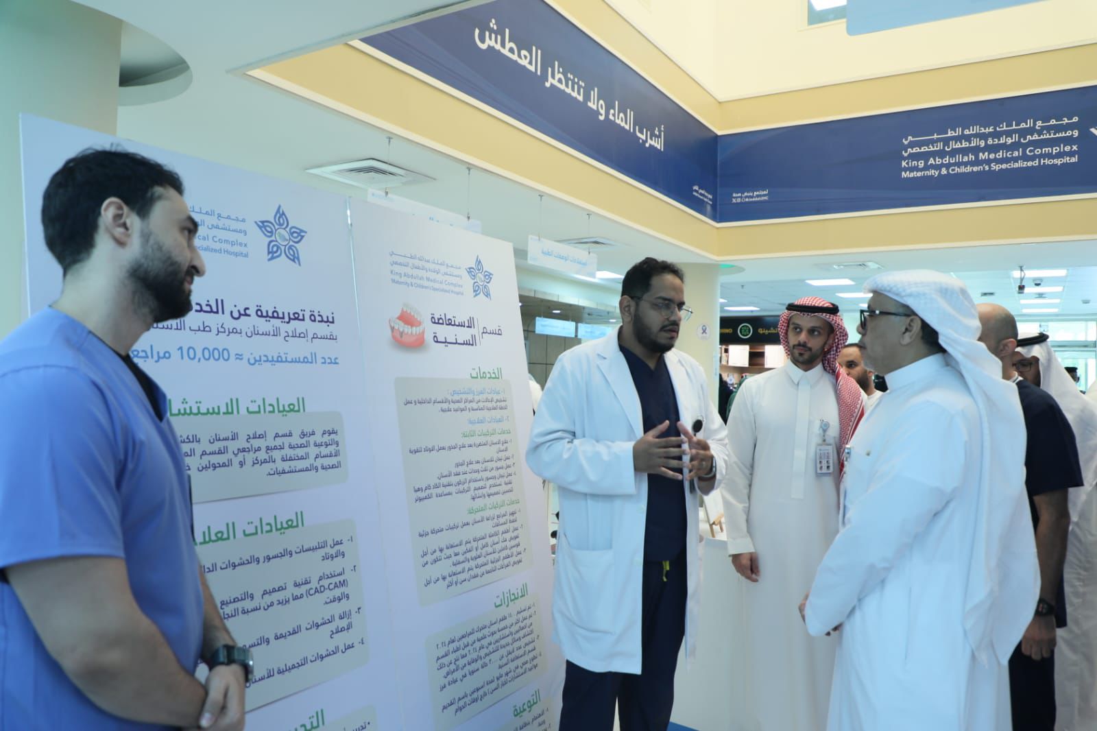تحت رعاية وحضور المشرف العام على مجمع الملك عبدالله الطبي ومستشفى الولادة والأطفال التخصصي الدكتور محمود أبو رمش أقام مركز طب الأسنان التخصصي التابع لمجمع الملك عبدالله الطبي عضو تجمع جدة الصحي الثاني معرضًا للتعريف بخدمات المركز وإنجازاته وبرامجه التوعوية الصحية، في بهو مبنى العيادات الخارجية للموظفين والمراجعين والزوار، بحضور مساعد المشرف العام للخدمات الطبية الدكتور هاني عقاد ونائب مساعد المشرف العام للتميز الصحي ومكافحة العدوى الدكتور محمد الوافي ومدير مركز طب الأسنان التخصصي الدكتور خالد بافيل والمشرف على الشؤون الفنية والتنظيمية الأستاذ عبدالله الغامدي وعددًا من مدراء الإدارات ورؤساء الأقسام.