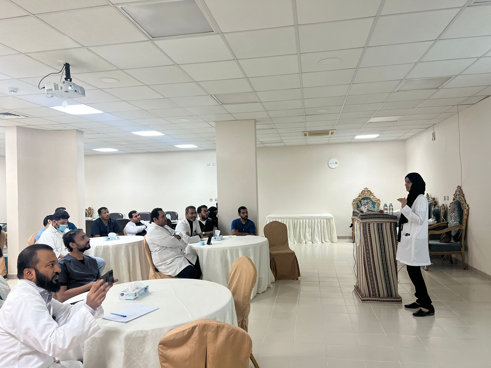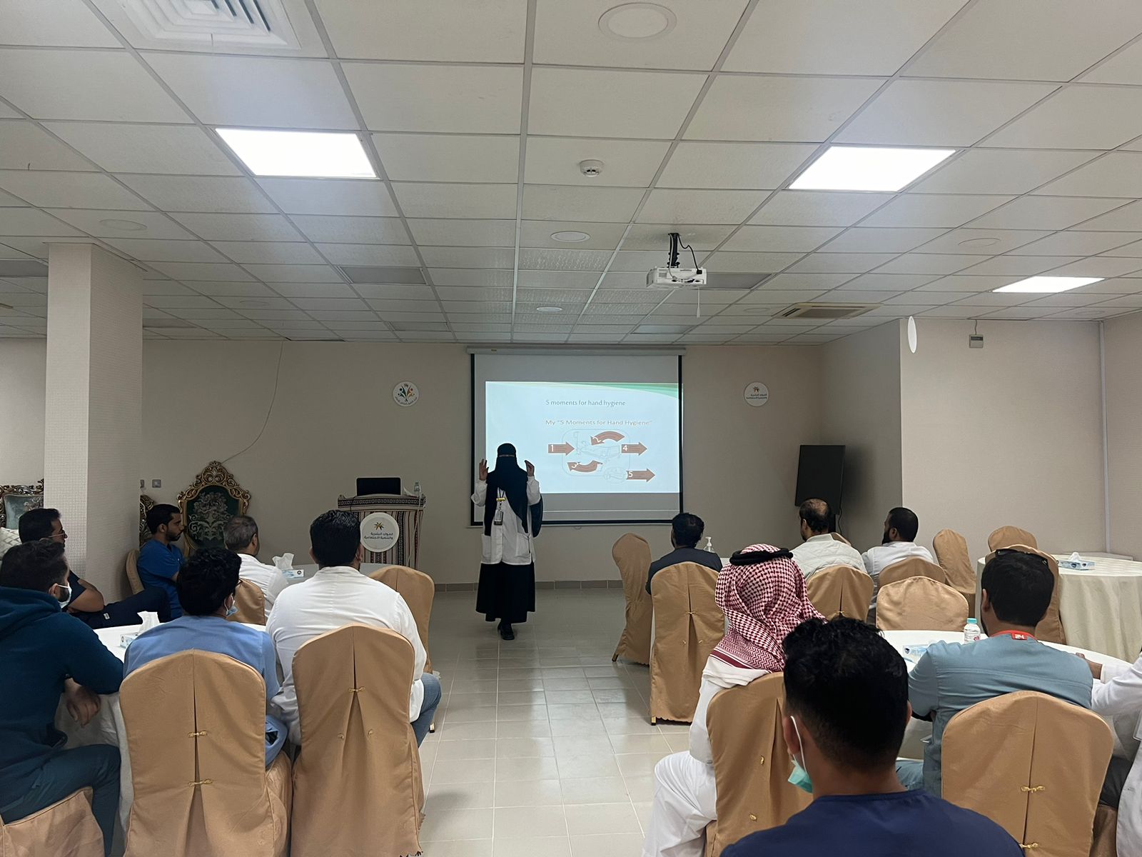 حيث تم خلال البرنامج تقديم عدة محاضرات علمية لشرح إجراءات وسبل التعقيم ومكافحة العدوى وطرق التعامل مع الحالات المختلفة تضمنت طرق تعقيم الأجهزة والأدوات وطرق الوقاية من العدوى عند تقديم الخدمة من أساليب غسل وتعقيم اليد و شرح الترتيب الصحيح عند ارتداء ونزع الأدوات والسترة الخاصة بمكافحة العدوى.
