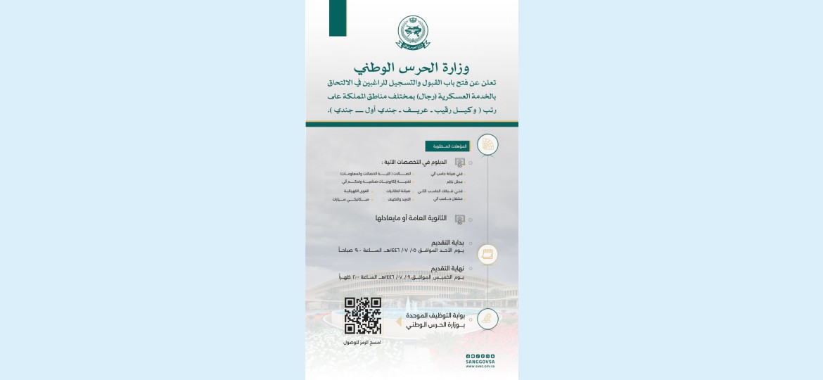 أعلنت وزارة الحرس الوطني عن فتح باب القبول والتسجيل للراغبين في الالتحاق بالخدمة العسكرية للرجال في مختلف مناطق المملكة، وذلك على رتب وكيل رقيب، عريف، جندي أول، وجندي.