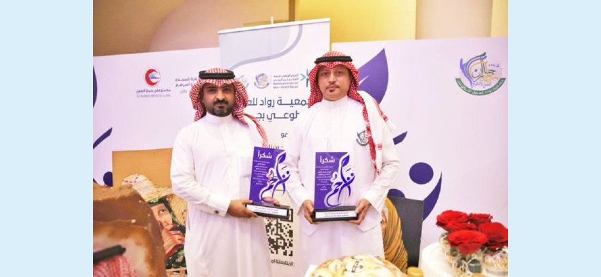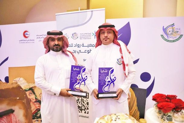 وفي نهاية الإحتفال ، تم تكريم جمعية رواد التطوعي للعمل بجازان ممثلة برئيس الجمعية الدكتور علي دبيع .