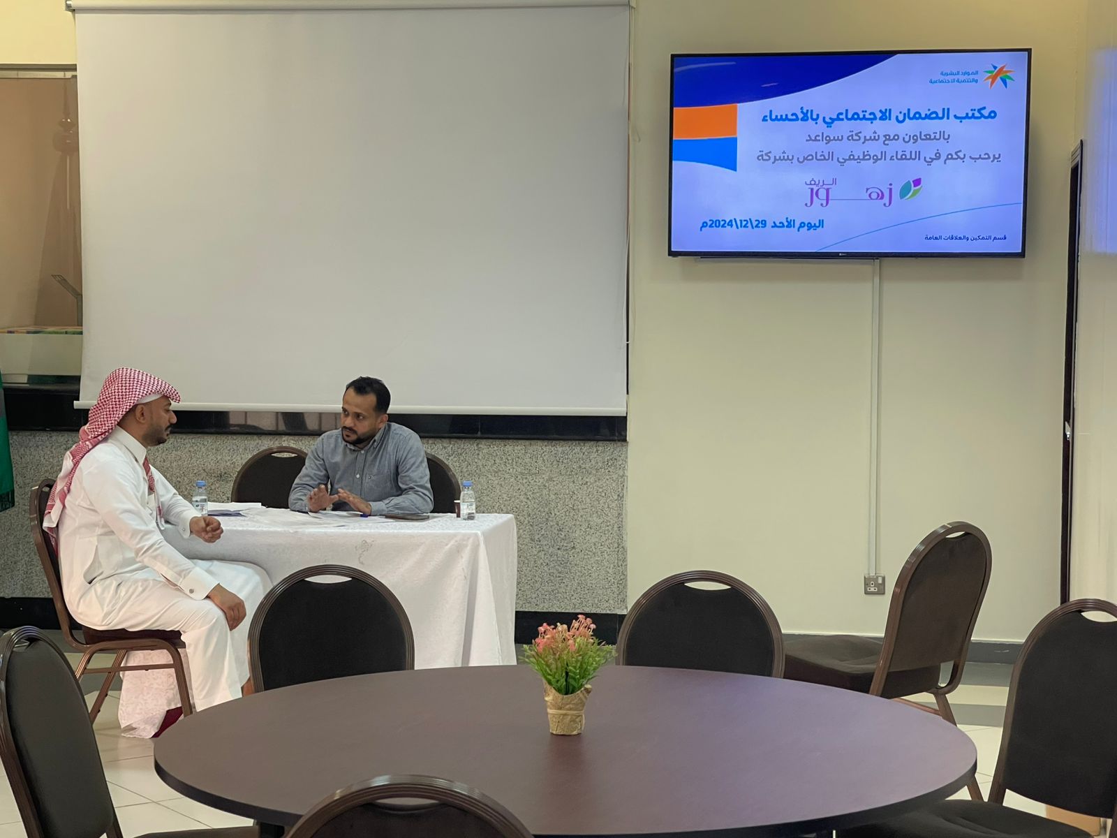 ضمن سلسلة المبادرات واللقاءات الوظيفية المستمرة التي يسعى لها قسم التمكين بمكتب الضمان الاجتماعي بالاحساء لتمكين مستفيدي الضمان وأبنائهم ، نظم "تمكين " ضمان الأحساء لقاءً وظيفياً بالتعاون مع شركة سواعد وشركة زهور الريف.