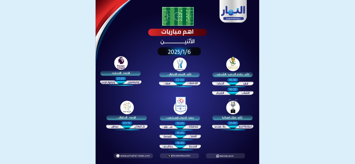 تشهد الساحة الكروية اليوم العديد من المواجهات المثيرة في مختلف البطولات، حيث يلتقي: