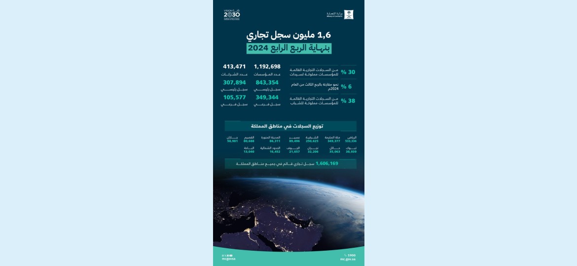 وبيّنت الوزارة أن 30% من السجلات التجارية القائمة للمؤسسات مملوكة لسيدات، بينما يشكل الشباب نسبة 38% من إجمالي المالكين للسجلات التجارية. وبلغ عدد المؤسسات المسجلة 1,192,698 مؤسسة، منها 843,354 سجلًا رئيسيًا و349,344 سجلًا فرعيًا. في حين بلغ عدد الشركات 413,471 شركة، تشمل 307,894 سجلًا رئيسيًا و105,577 سجلًا فرعيًا.