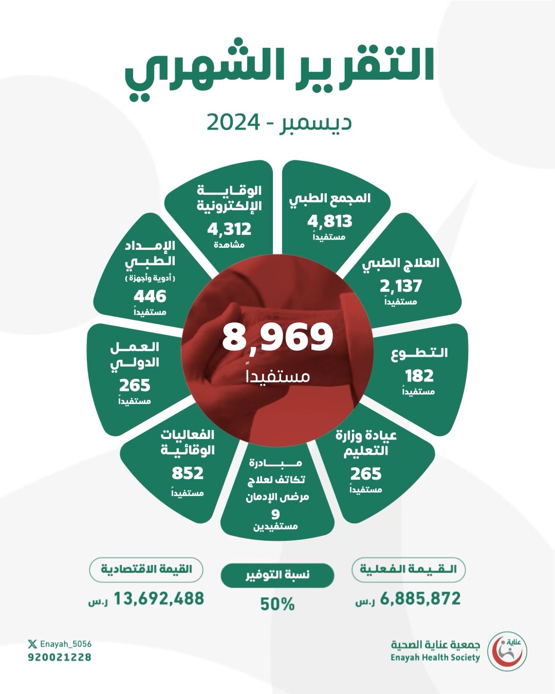أكد الأمين العام للجمعية، الدكتور/ سلمان بن عبد الله المطيري، أن  جمعية عناية  قدمت خدماتها الصحية لـ 8,969 مستفيدًا خلال شهر ديسمبر، بقيمة اقتصادية بلغت 13,692,488 ريالًا، ومن بين هؤلاء المستفيدين تم علاج 2,137 حالة ضمن العلاج الخيري بقيمة اقتصادية 7,579,516 ريالًا، وقيمة فعلية 5,413,940 ريالًا، مستفيدةً من حسومات شركاء النجاح بنسبة 29%، مما أسهم في علاج المرضى المستهدفين بالعلاج في ديسمبر.