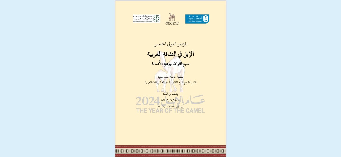 برعاية رئيس  جامعة الملك سعود  أ.د. عبد الله السلمان تنظم  جامعة الملك سعود  بالشراكة مع مجمع الملك سلمان العالمي للغة العربية المؤتمر الدولي الخامس الإبل في الثقافة العربية الذي ينعقد في أيام الثلاثاء والأربعاء والخميس الموافق 14-16/7/1446هـ -14-16/7/2025م.