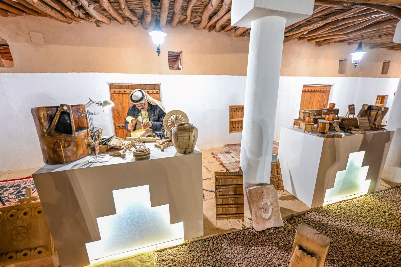وصناعة الجلديات والحقائب الجلدية المطرزة والفاخرة  وحرفة النطو  وصناعة الخناجر والسيوف والزخرفة والتطعيم بالأحجار الكريمة، وبعض النماذج والمجسمات لبيوت الشعر ومقتنياتها، إضافة إلى حرفة تطريز النقوش الثمودية والمذيلات الحجريّة النادرة  على العباءات النسائية ، وصناعة الحبال والنوافذ القديمة والنحت على الحجارة بأشكال فنية .