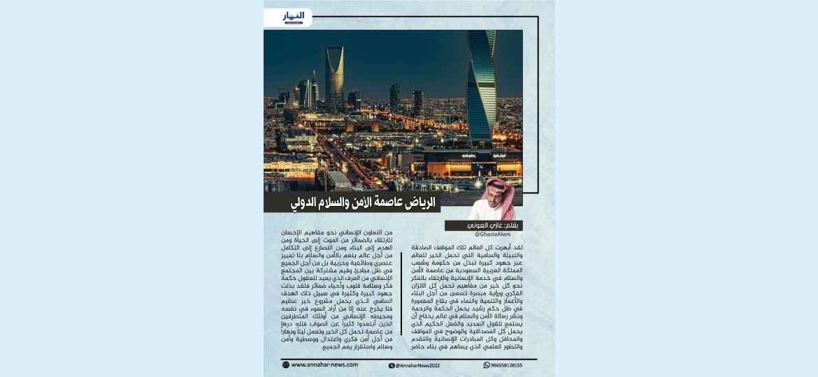 لقد أبهرت كل العالم تلك المواقف الصادقة والنبيلة والسامية التي تحمل الخير للعالم عبر جهود كبيرة تبذل من حكومة وشعب المملكة العربية السعودية من عاصمة الأمن والسلام في خدمة الإنسانية والارتقاء بالفكر نحو كل خير من مفاهيم تحمل كل الاتزان الفكري ورؤية مبصرة تسعى من أجل البناء والأعمار والتنمية والنماء في بقاع المعمورة في ظل حكم رشيد يحمل الحكمة والرحمة ونشر رسالة الأمن والسلام في عالم يحتاج أن يستمع للقول السديد والفعل الحكيم الذي يحمل كل المصداقية والوضوح في المواقف والمحافل وكل المبادرات الإنسانية والتقدم والتطور العلمي الذي يساهم في بناء حاضر من التعاون الإنساني نحو مفاهيم الإحسان للارتقاء بالضمائر من الموت إلى الحياة ومن الهدم إلى البناء ومن التصارع إلى التكامل من أجل عالم ينعم بالأمن والسلام بلا تمييز عنصري وطائفية وحزبية بل من أجل الجميع في ظل مبادئ وقيم مشتركة بين المجتمع الإنساني من العرف الذي يعيد للعقول حكمة فكر وسلامة قلوب وأحياء ضمائر فلقد بذلت جهود كبيرة وكثيرة في سبيل ذلك الهدف السامي الذي يحمل مشروع خير عظيم فلا يخرج عنه إلا من أراد السوء في نفسه ومحيطه الإنساني من أولئك المتطرفين الذين أبتعدوا كثيراً عن الصواب فلله درها من عاصمة تحمل كل الخير وتعمل ليلاً ونهاراً من أجل أمن فكري واعتدال ووسطية وأمن وسلام واستقرار يعم الجميع.