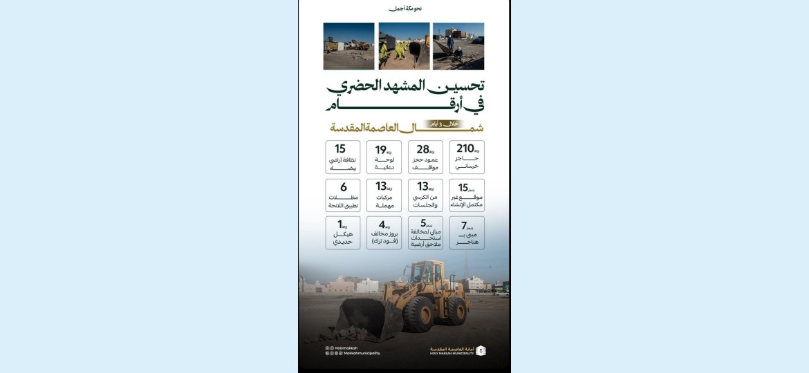نفذت أمانة العاصمة المقدسة، بالتعاون مع الجهات الأمنية، حملة مشتركة لإزالة الهناجر والمظلات العشوائية المخالفة خارج حدود الملكية، بالإضافة إلى إزالة التعديات على الشوارع شمال مكة المكرمة، وذلك ضمن جهودها لتحقيق أهداف معالجة التشوه البصري وتحسين المشهد الحضري وتحقيق الانضباط العمراني.