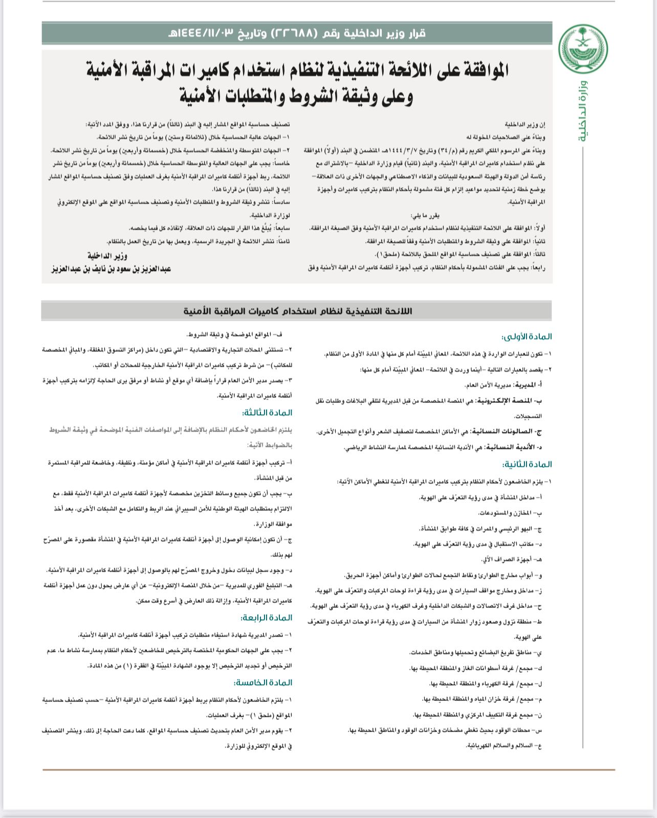 أعلنت وزارة الداخلية صدور اللائحة التنفيذية لنظام استخدام كاميرات المراقبة الأمنية ووثيقة الشروط والمتطلبات الأمنية لتركيب نظام المراقبة والمواصفات الفنية العامة لأجهزة أنظمة كاميرات المراقبة الأمنية.