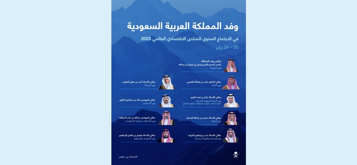 تشارك المملكة بوفد رفيع المستوى في الاجتماعي السنوي للمنتدى الاقتصادي العالمي 2025م المقام في دافوس.