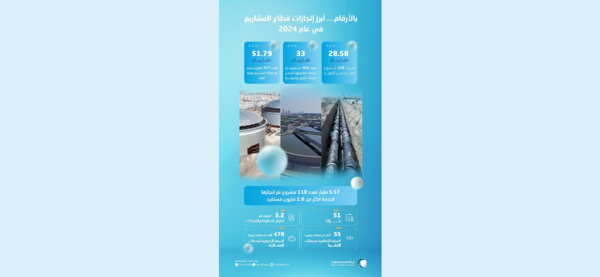 أنجزت شركة المياه الوطنية (118) مشروعًا مائيًا وبيئيًا خلال عام 2024 في جميع مناطق المملكة، حيث بلغت كُلفتها أكثر من 5 مليارات ريال، وتخدم (1.8) مليون مستفيد.