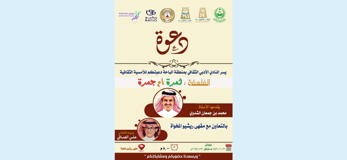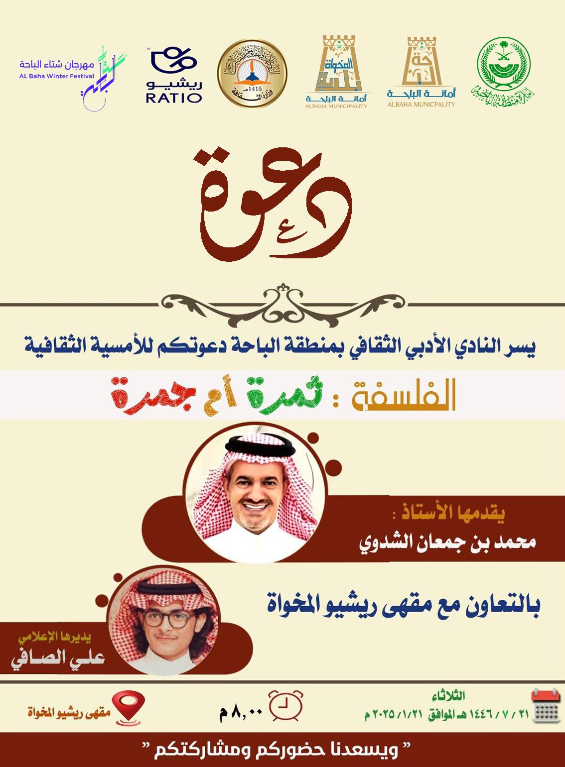 وزاد أن النادي حرص على تنويع الأوعية الثقافية لخلق حراك ثقافي يستثمر في إبداعات أبناء المنطقة بإبراز حضورهم عبر منصاته المختلفة وبالتعاون مع عدد من الجهات منها بلدية المخواة ومقهى ريشيو وهيئة التراث والغرفة التجارية وحديقة رواسي تهامة ومزرعة أرياف تهامة مضيفًاً أن أولى الأمسيات ستكون بمقهى ريشيو ببوليفارد المخواة مساء غد الثلاثاء الموافق ٢١ رجب ١٤٤٦ هـ وهي عبارة عن أمسية فلسفية بعنوان (الفلسفة ثمرة أم جمرة ؟) يحييها الأستاذ