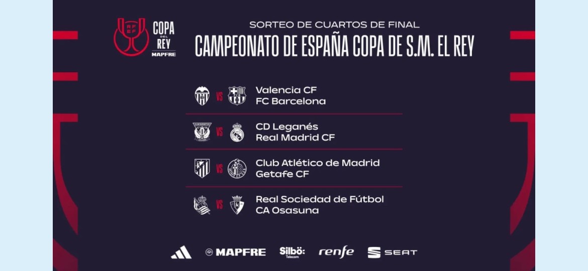 وفي مواجهات أخرى، يستضيف أتلتيكو مدريد فريق خيتافي في ديربي مدريدي جديد، بينما يلتقي ريال سوسيداد مع أوساسونا. ومن المقرر إقامة المباريات بين 4 و6 فبراير المقبل.