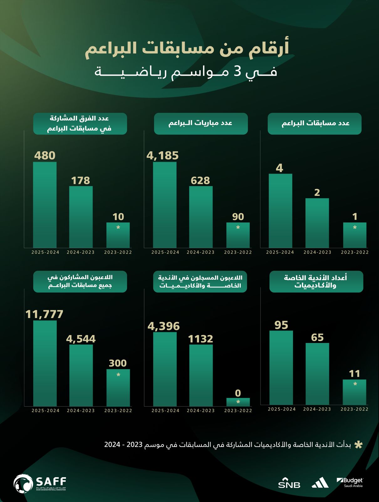 وأكملت الإدارة الفنية خلال عام 2024 عقد تأسيس دوريات البراعم للفئتين العمريتين 12 و14 عامًا لتكون إلى جانب الفئتين 11 و13 عامًا، لتحقق التكامل العمري قبل المشاركة الرسمية للفئة العمرية في دوريات 15 عامًا وهي (الدوري الممتاز - دوري الدرجة الأولى - بطولة أندية المملكة لأندية الدرجة الثانية) حيث يشارك في الدوريات 478 مشتركًا ما بين نادٍ حكومي، أكاديمية خاصة، نادٍ تجاري ومركز تدريب إقليمي.