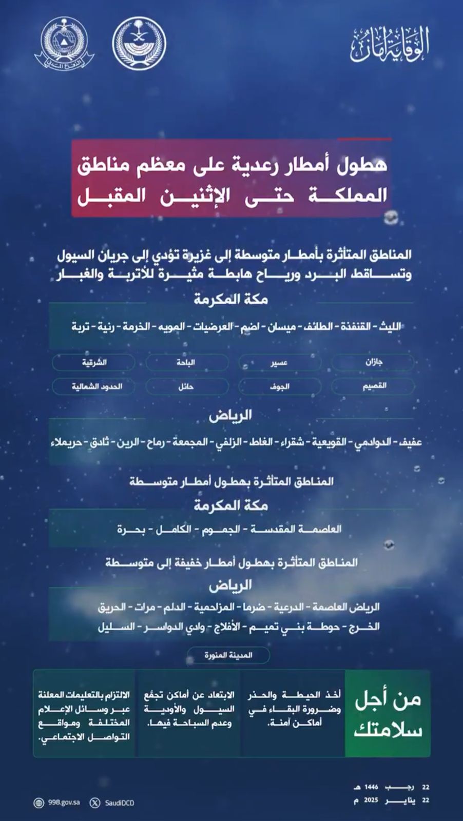 دعت المديرية العامة للدفاع المدني إلى أخذ الحيطة والحذر، وضرورة البقاء في أماكن آمنة والابتعاد عن أماكن تجمُّع السيول والأودية وعدم السباحة فيها، والالتزام بالتعليمات المعلنة عبر وسائل الإعلام المختلفة ومواقع التواصل الاجتماعي؛ وذلك لهطول أمطار رعدية على معظم مناطق المملكة، حتى الاثنين المقبل.